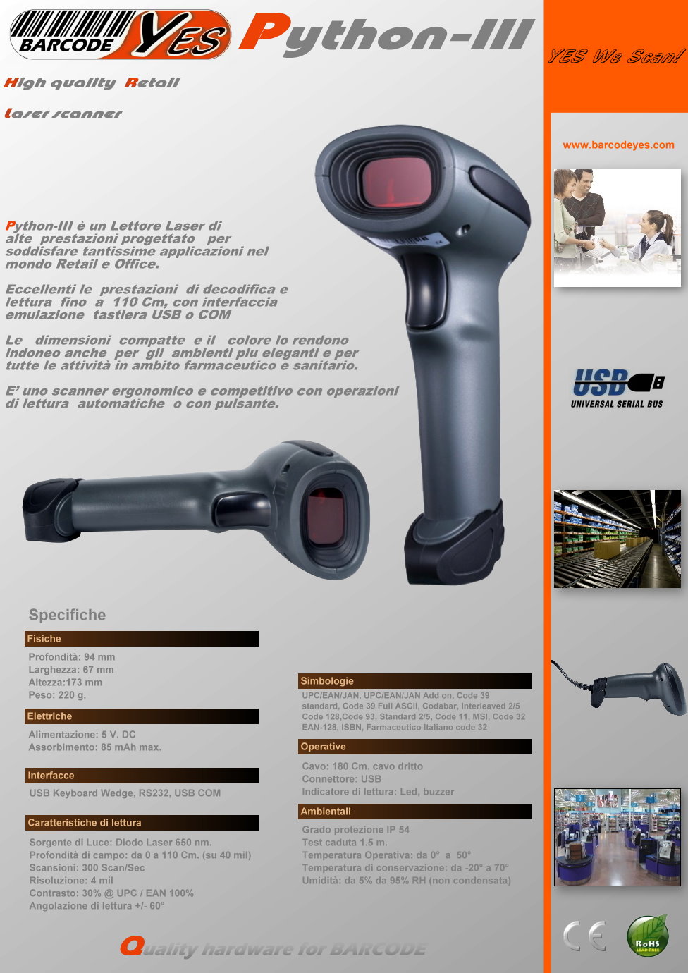 | Il KIT in questa offerta include | 1) PYTHON "Il famoso" lettore di alte prestazioni con decoder integrato ad alta velocità 2) 300 scansioni al secondo !! il dato piu' importante per valutare le prestazioni di un lettore (Processore addirittura a 32 BIT !!) 3) Software di Magazzino MAGAWOLRD Versione Light (Carico / Scarico / Etichette barcode / Database fotografico articoli / scorte) 4) Trattandosi di Prodotti Italiani, l'assistenza del produttore è anche telefonica (in Italiano) 5) Il prodotto Viene spedito generalmente in 24 ore Tramite corriere espresso GLS o TNT |