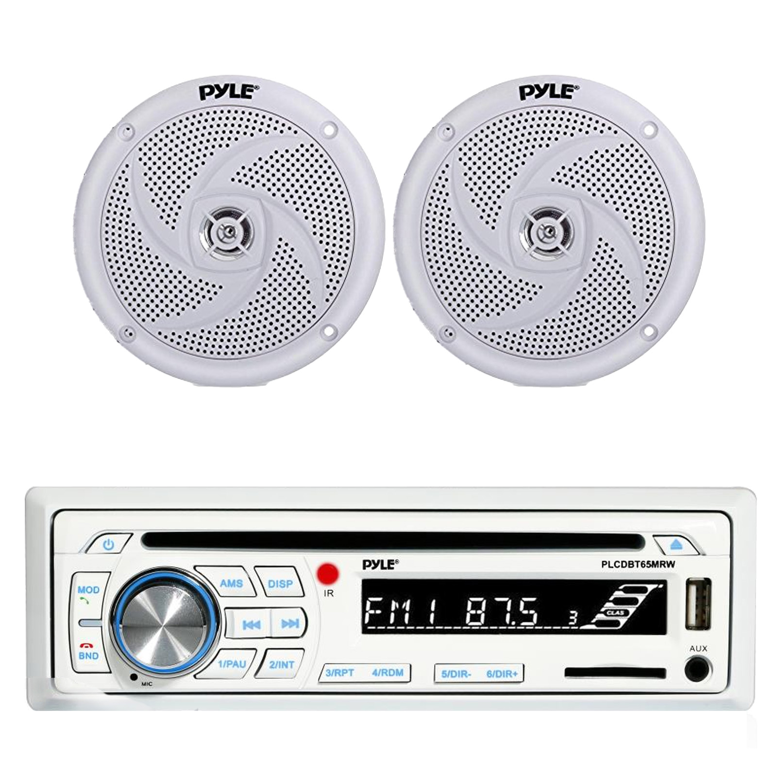 PACKAGE BUNDLE INCLUDES: Pyle PLCDBT65 Single DIN USB Bluetooth Marine AM/FM CD Stereo Receiver with 2x 5.25" 180 Watt Peak Power 2-Way Waterproof Low Profile Slim Style Boat Audio Speakers (White)