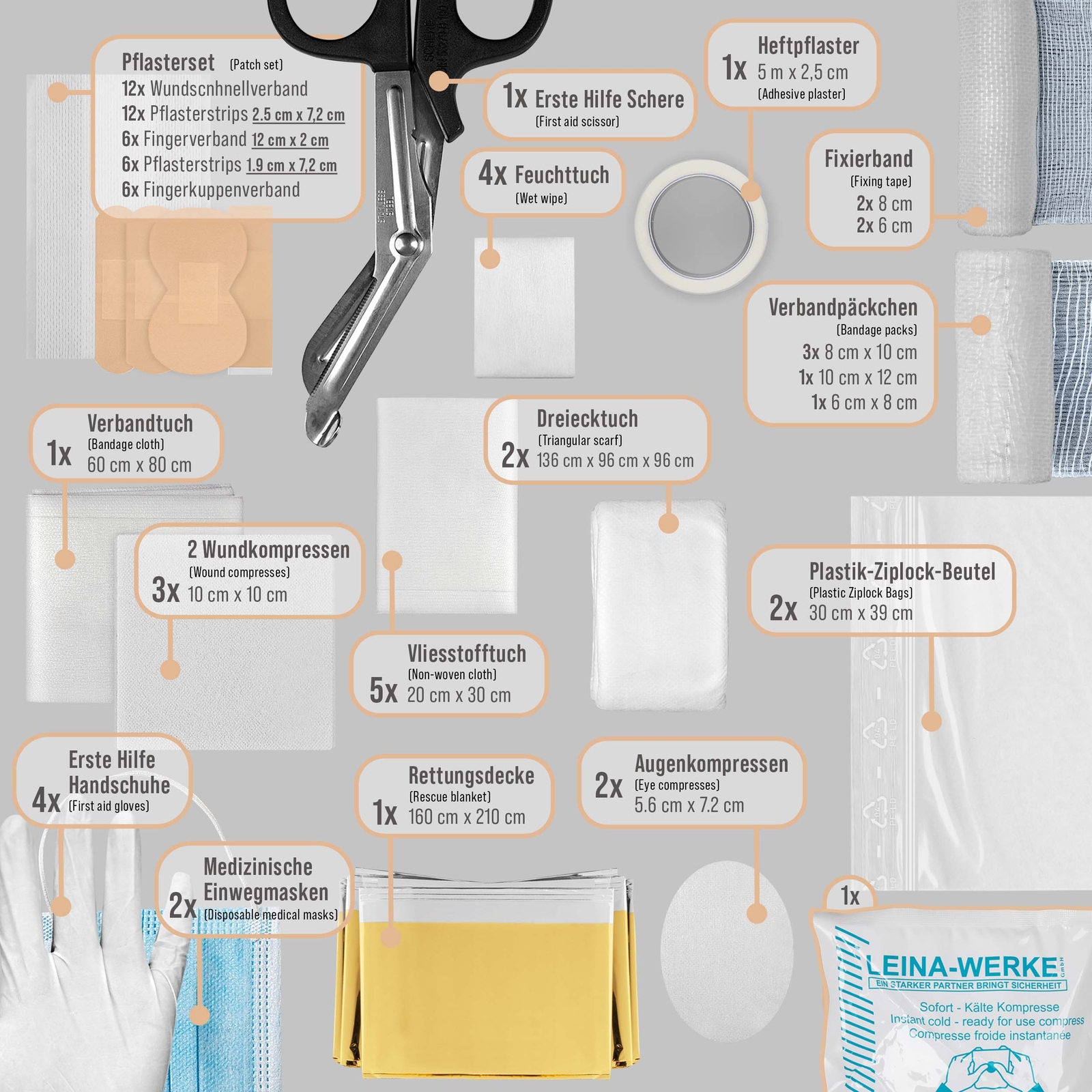Das umfangreiche Erste-Hilfe-Kit kann auch als Ergänzungsset / Nachfüllset oder als Füllung für Medizinschrank, Verbandschrank, Apothekerschrank zuhause im privaten Haushalt verwendet werden.