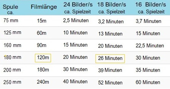 Im Privatbereich filmte man überwiegend mit 18 Bildern pro Sekunde. Bei 120m Super 8 Film und 18 Bilder/s hat der Film eine Spielzeit von 26:40 Minuten.