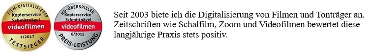 Digitalisierung von FilmenDer Preis bezieht sich auf die Digitalisierung von einer Spule bis 120m Film, inkl. DVD Rohling.