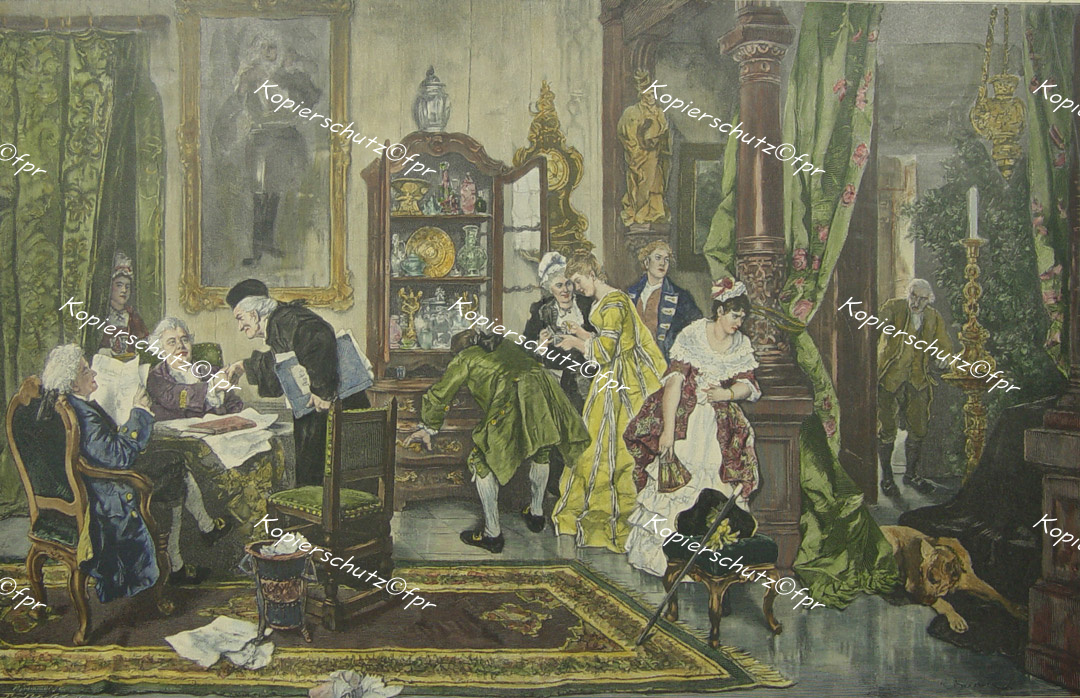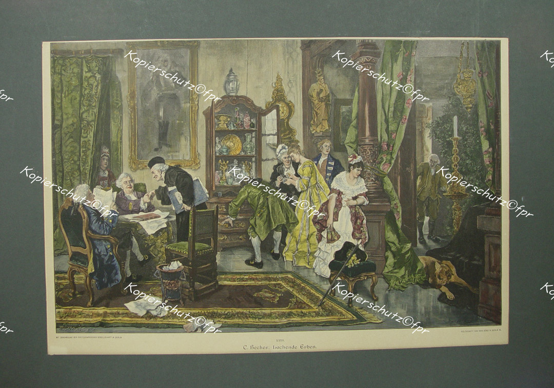 Becker, Carl Ludwig Friedrich (1820 in Berlin - 1900 ebenda): "Lachende Erben" originaler handkolorierter Holzstich ca.33x51cm (Darstellung/image size) von Richard Bong nach einem Gemälde von Becker auf Papier (40,5x54,5cm) unterhalb der Darstellung typographisch betitelt und bezeichnet; Berlin um 1890