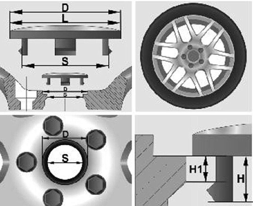 | NABENKAPPEN NABENDECKEL Passen für folgende Felgen: Abmessung: D = 54.5 mm - Deckel Durchmesser S = 51 mm - Felgenloch Durchmesser L = 53 mm - Aufkleber Durchmesser H = 10 mm - Deckel Montagefuß Länge H1= 4 mm - Deckel Montagefuß Länge bis Halter Lieferumfang: 4x Nabendeckel für Alufelgen ohne Logo Kompatibel mit verschiedenen Autoherstellern Material: Hochqualitätskunststoff Farbe: grau Vergleichen Sie bitte die Maßzeichnung mit Ihren Felgen!!! in unseren anderen Auktionen finden Sie Zentrierringe ab € 6,00 (4Stück). |
