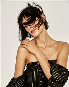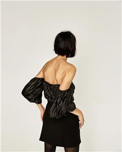 Off-the-shoulder top with stretch neckline. Full sleeves and metallic striped fabric. Rear zip fastening.