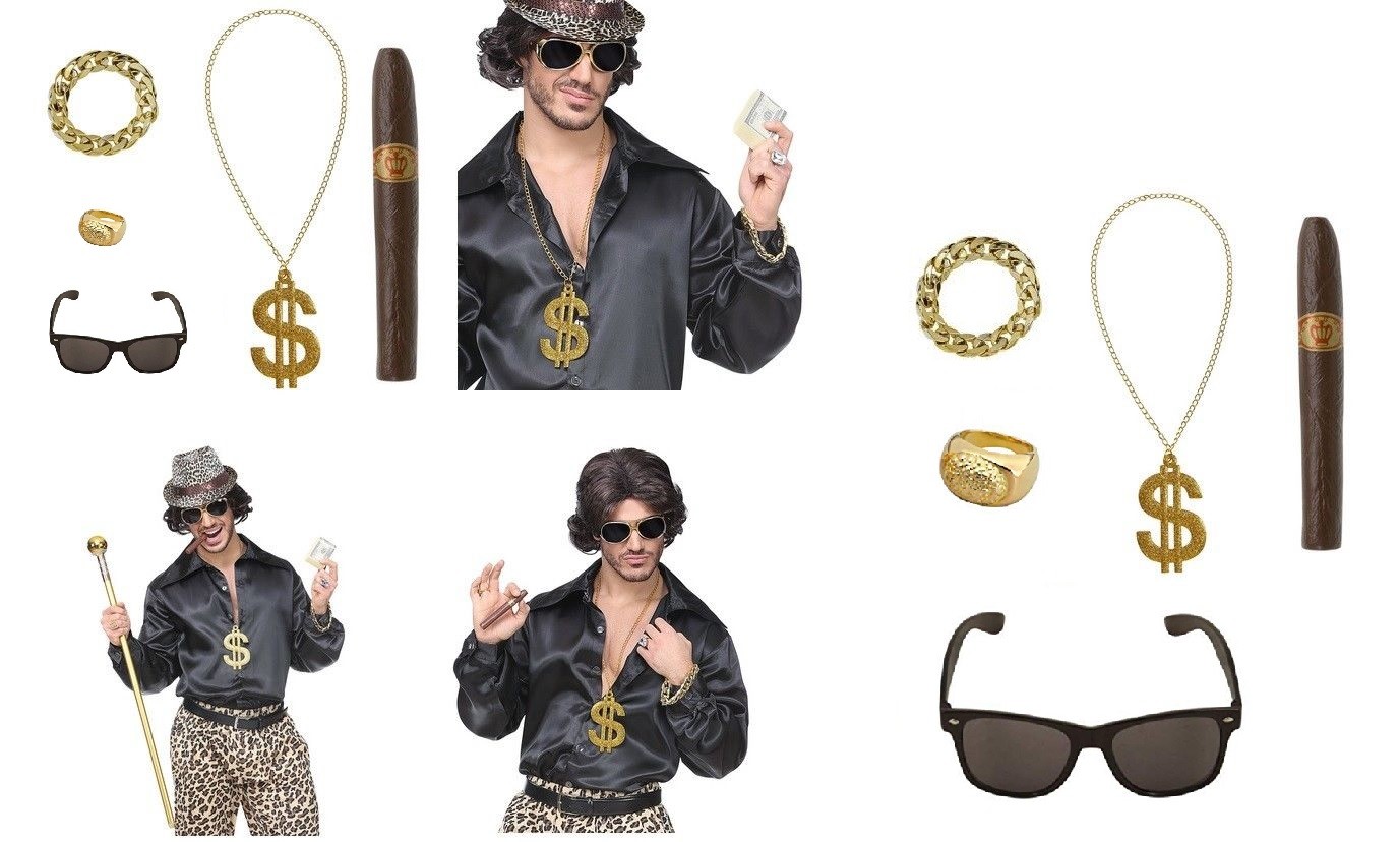 Package Include: Black Wayfarer Style Glasses, Gold Metal Chain, Sovereign Ring, Bracelet & Fake Cigar