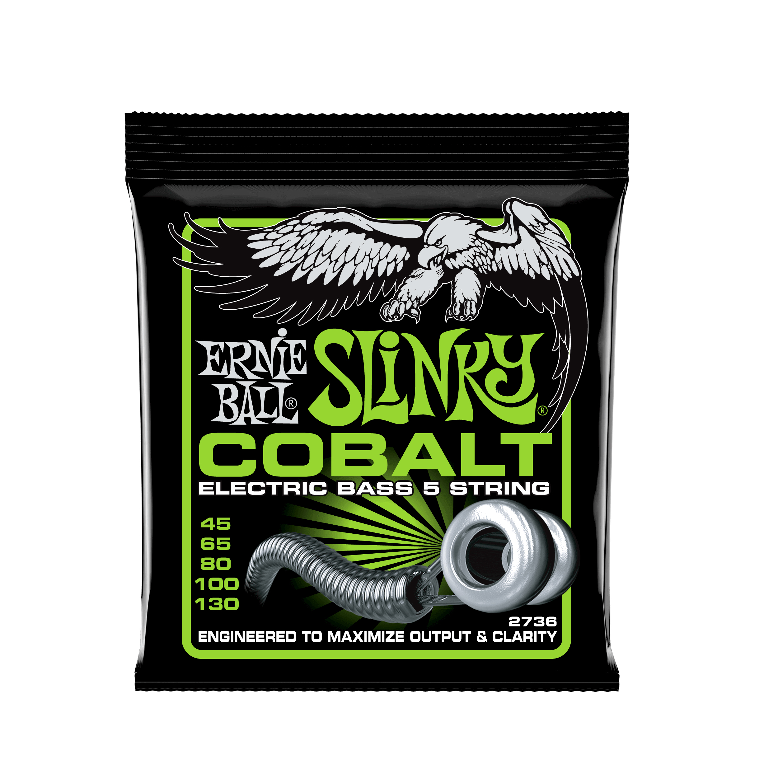 Ernie Ball Bass 5 Slinky Cobalt Electric Bass Strings - 45-130 Gauge. Ernie Ball Cobalt Slinky Electric Bass Guitar Strings provide an extended dynamic range, incredible harmonic response, increased low end, and crisp, clear highs. Cobalt provides a stronger magnetic relationship between pickups and strings than any other alloy previously available. Cobalt Slinky bass guitar strings are also soft and silky to the touch, making string bending a breeze. Gauges .045, .065, .080, .100, .130