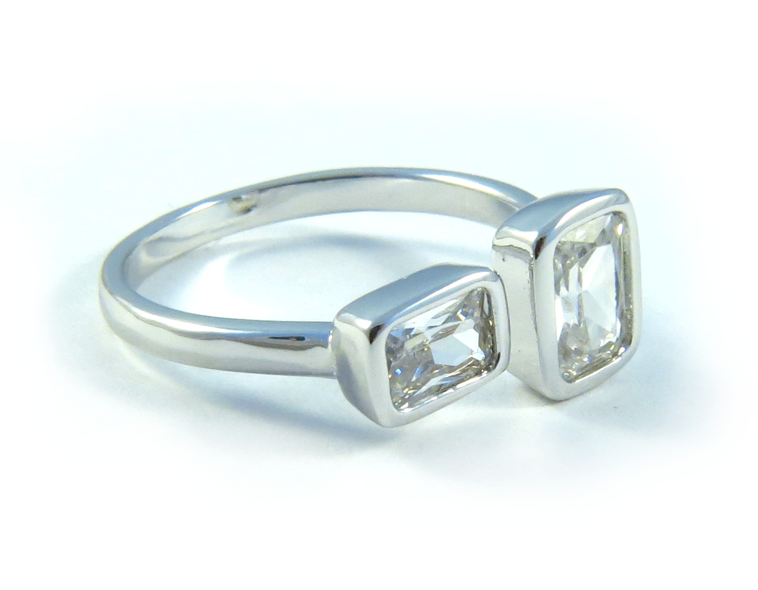 Platinierter Ring. Hochwertiger platinierter Ring mit zwei Schliffsteinen aus Glas. Der Schliff orientiert sich am Diamantschliff, wodurch schöne Farbreflexe entstehen. Der Ring hat einen Innendurchmesser von ca. 17mm und lässt sich individuell anpassen. Der größere Stein hat einen Durchmesser von 8x6mm. Stück. |