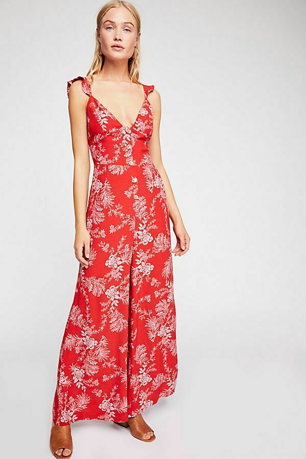Details: Lightweight printed jumpsuit featuring button closures down the front. V-neckline. Wide legs. Ruffle trim along the straps.