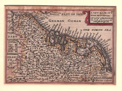 [London: William Humble:1627]. A fine original minature map of the XVII Provinces of Low Germanie including Germany, Holland and Belgium, etc., with fine later hand-colouring. The map engraved by Pieter van der Keere in c1627. Image size approx. 84mm x 122mm, with better than normal margins for this type of map, with text to verso. An usually VG bright impression of this rare 'Miniature Speed' map. The map comes professionally mounted and wrapped in cellophane.