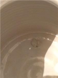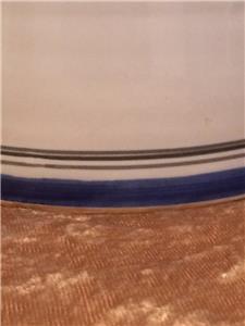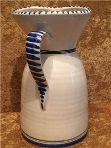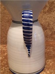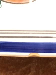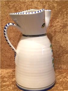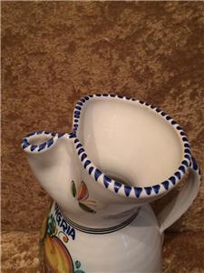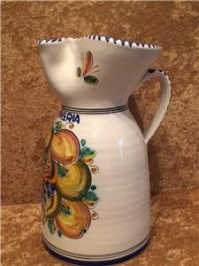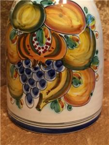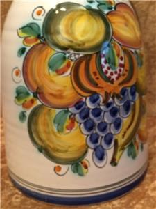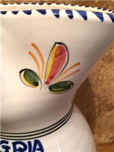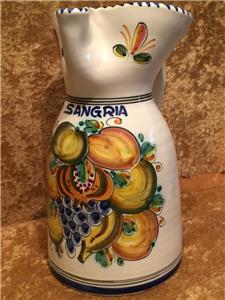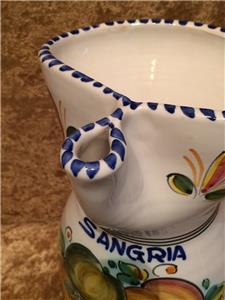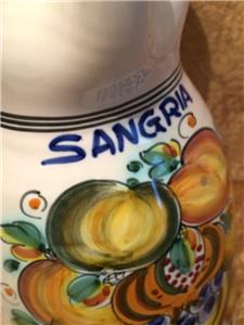 The piece is highly glazed with the main background color white. The hand painted fruit motif is very colorful and representative of Sangria. The navy blue trim around the rim, handle and base really sets this piece off beautifully. It is likely hand-thrown pottery. You can see and feel the horizontal ripples beneath the glaze. Since it is entirely handmade and hand painted, no two pieces are ever the same.