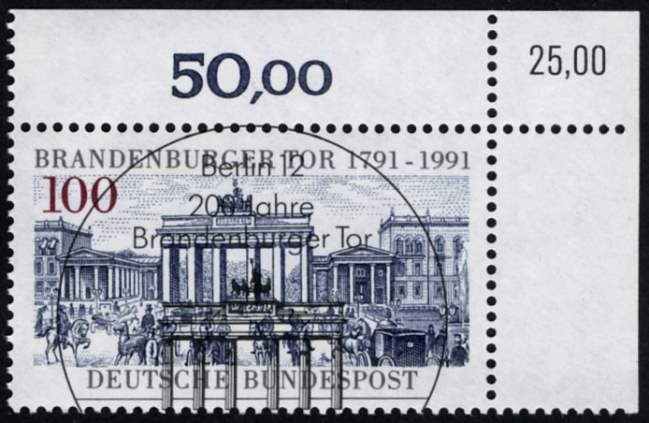 English: Germany, 1991. Michel-No. 1492 with special cancellation BERLIN. 1991, January 8th: Commemorative issue "Brandenburg Gate" 100 Pf Top right corner edge with additional corrected value print (KBWZ) “25,00" D-Mark. Stamp in perfect condition with full gum, not folded. Authenticity warranty. Rarely offered!