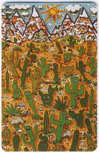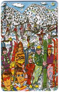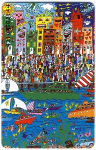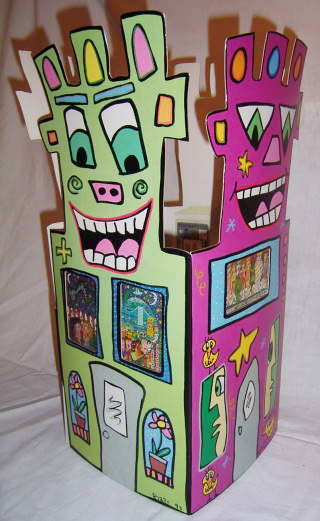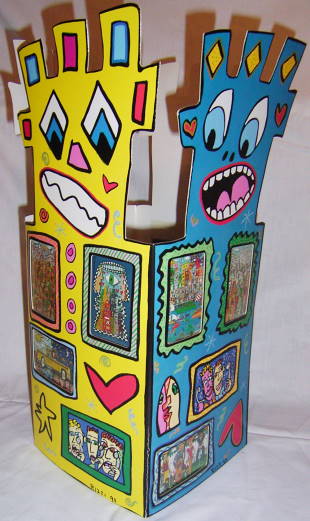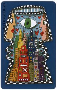 von James Rizzi, Pop-Art-Künstler aus New York, 1993 eigens für die Telefonkarten-Ausgabe entworfen. Dieser „Rizzi-Turm“ besteht aus einem ausgestanzten Karton, der in vier Segmente