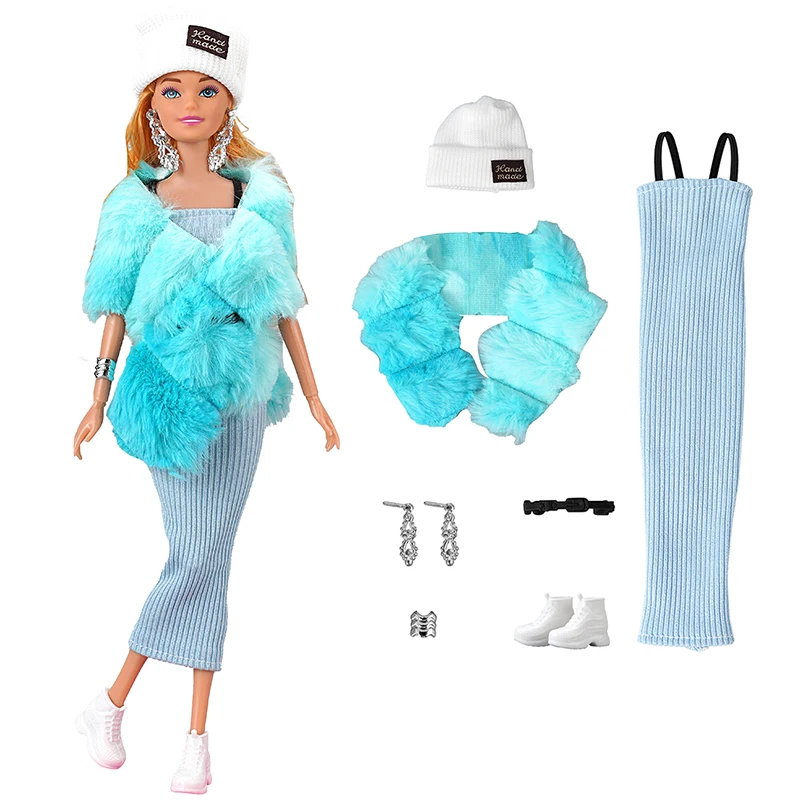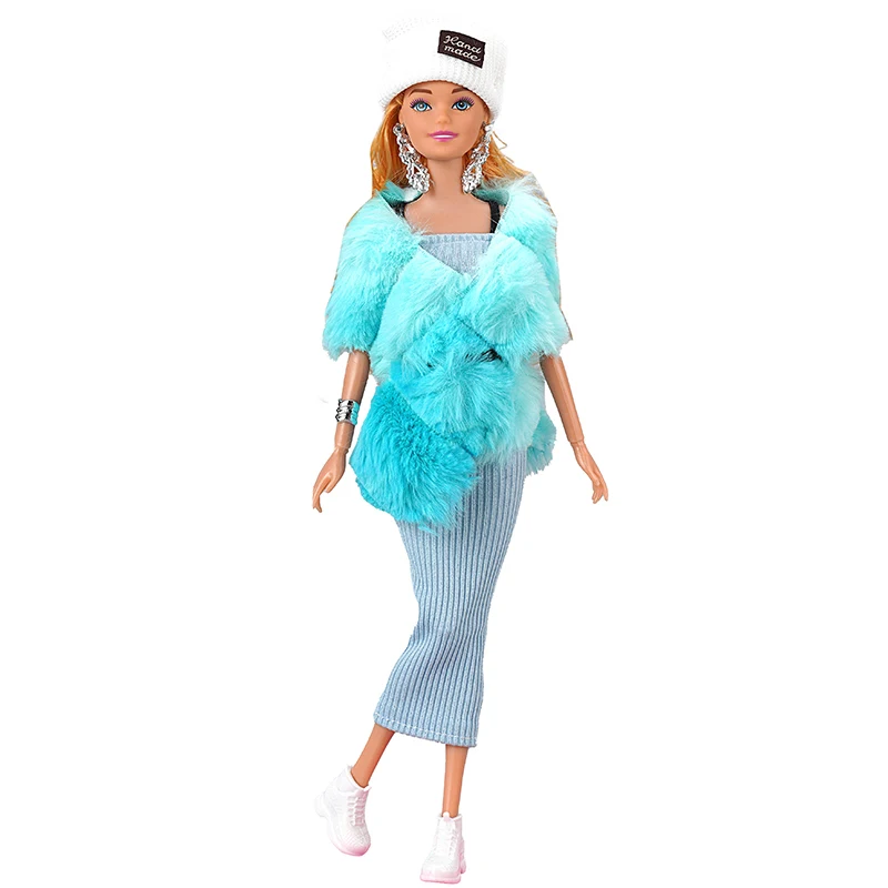 Blue Fur Shawl Coat Dress Hat Belt Shoes Bangle Earring For Barbie Doll Clothes Outfits 1/6 Dolls Accessories Kids DIY Toys