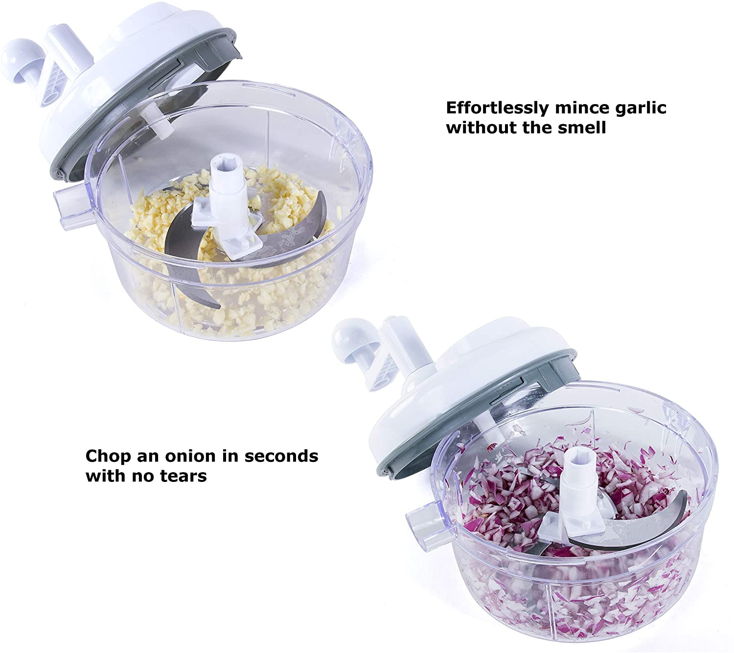 - VERSATILE - Perfect for slicing vegetables, chopping nuts, herbs, salsa, hummus, guacamole and more. Chop onions in seconds without crying and garlic without stinking up the kitchen. Chop veggies, shred cheese and make hash browns all with one tool! Manual operation allows you to achieve the consistency you want. Spin a few times for large chunks, spin more for smaller ones, and keep on turning if you want to puree the food.
