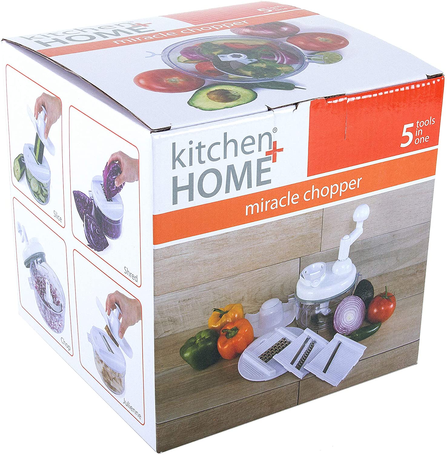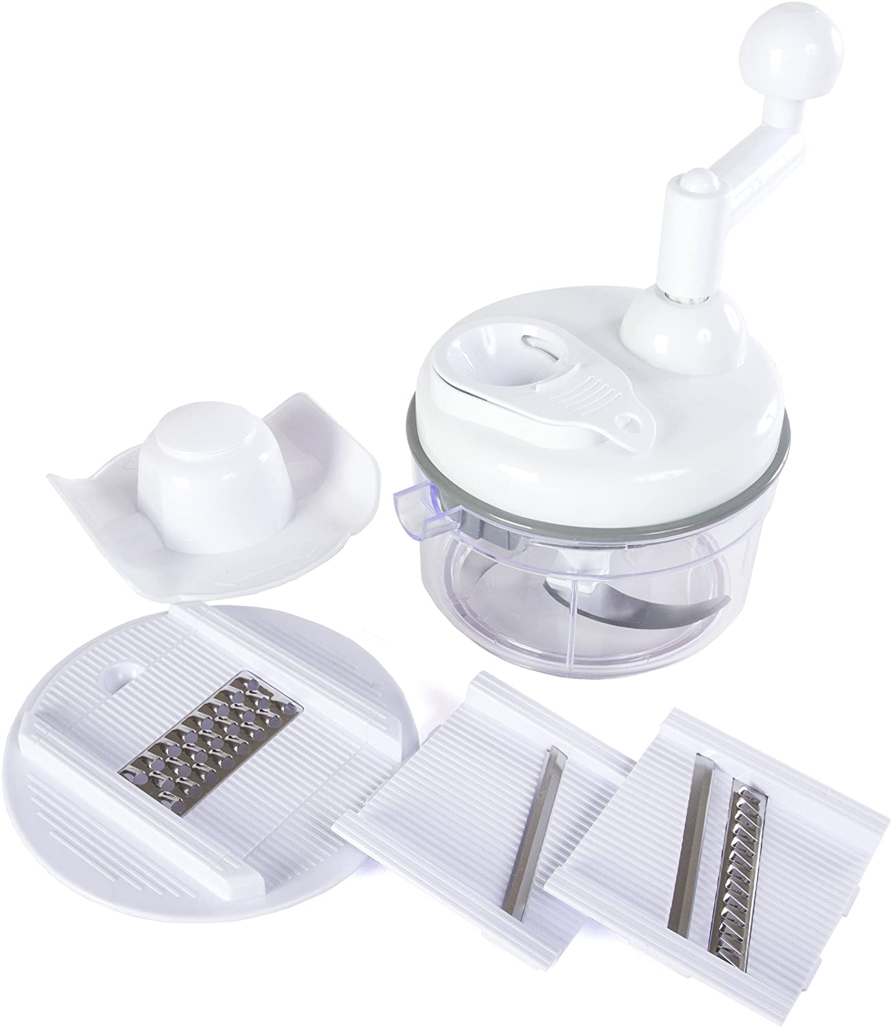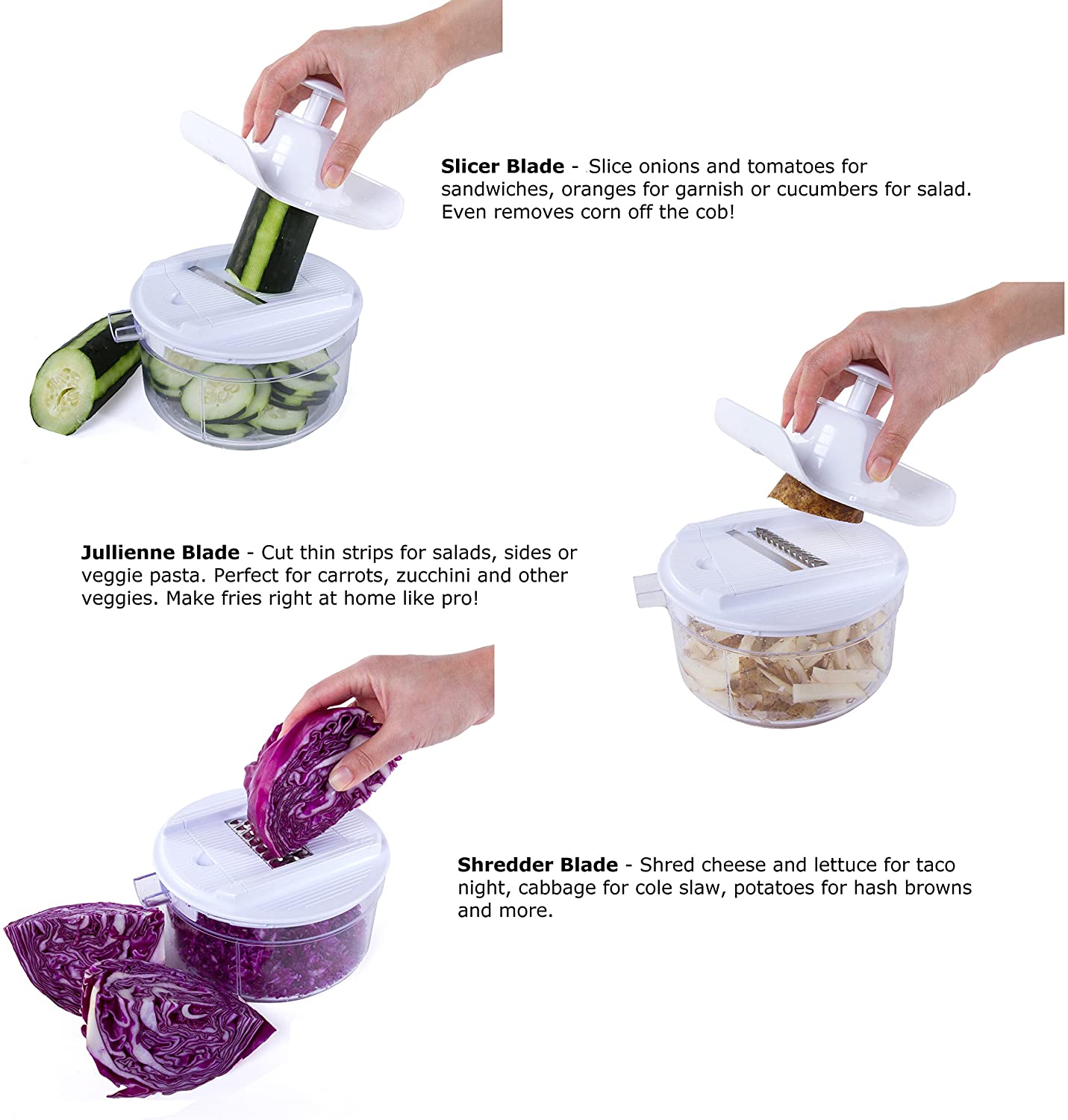 - 4-IN-1 - Not just a food chopper, the Miracle Chopper comes equipped with 3 mandoline inserts, egg white separator, food safety holder and recipe book. The mandoline inserts feature a slicer blade, julienne blade and shredder blade. Slice your favorite veggies with the slicer blade for sandwiches or salad. Even removes corn off the cob! Cut thin strips of different veggies like carrots and zucchini with the julienne blade. Shred cheese, lettuce and more with the shredder blade.