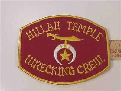 - Markings - as shown in photos - the patch has the typical Shriners graphic in the center and HILLAH TEMPLE - WRECKING CREW.