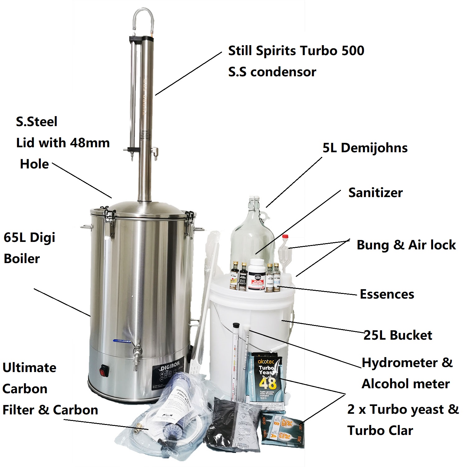 • This is 65L distillery kit with combination of Still Spirits Turbo 500 stainless steel condenser and 65L Digi boiler and a stainless steel lid as well as other products necessary.
