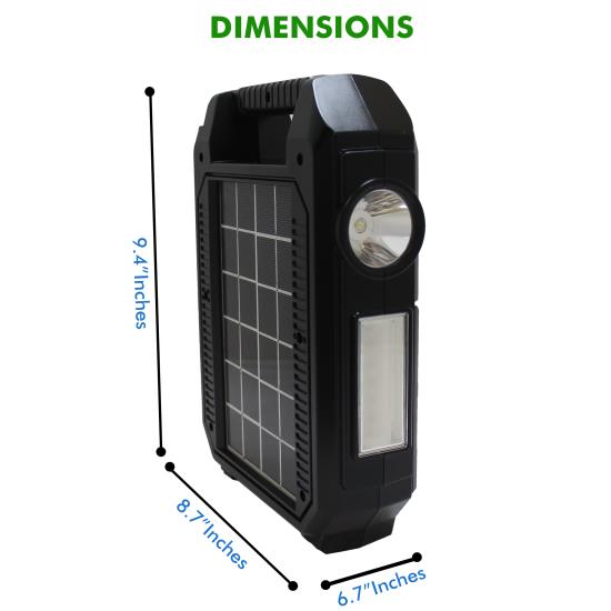 Charges in 9-10h via included power cord or 13h via solar panel (6V 3W). Includes 3 x LED light bulbs with individual 3m cords & on/off switches. Work light Floodlight. Includes USB cord with 5 charging ends (30-pin & Lightning for Apple, micro USB for Android, mini USB, & Nokia pin) for charging smartphones, tablets, digital cameras, etc.