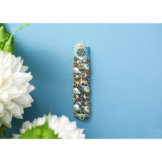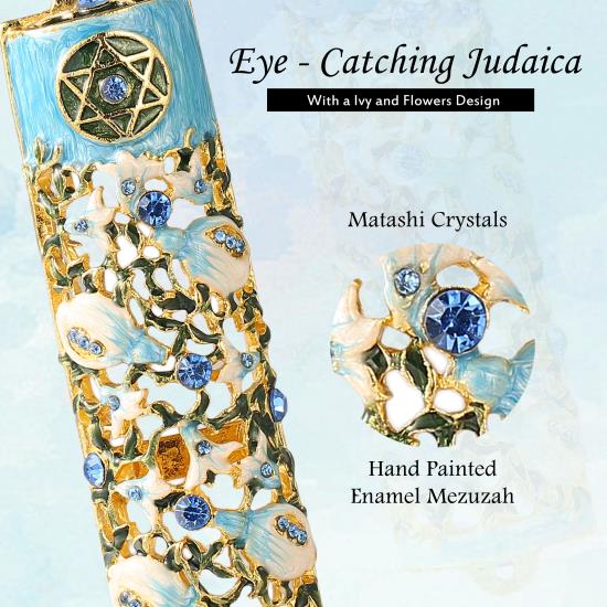 Matashi Hand Painted Enamel Mezuzah w/ Ivy and Flowers Design w/ Blue Crystals