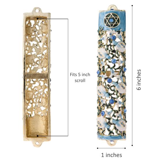 Clusters of tight growing vines stretch out over this mezuzah. With small white flowers blossoming all over. The perfect gift for someone who has just purchased a new house. Surprise the proud owners of a house with this religious symbol!