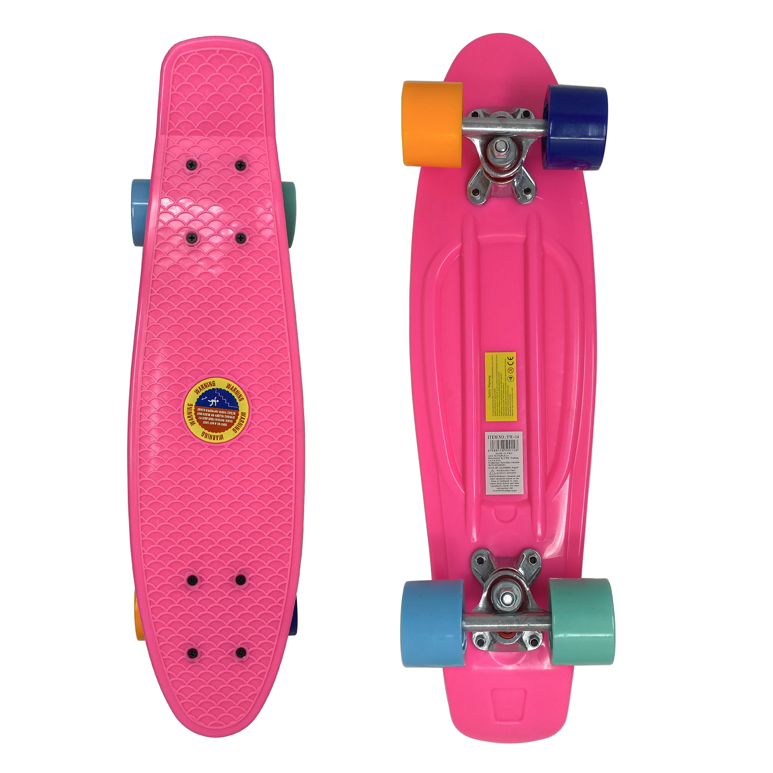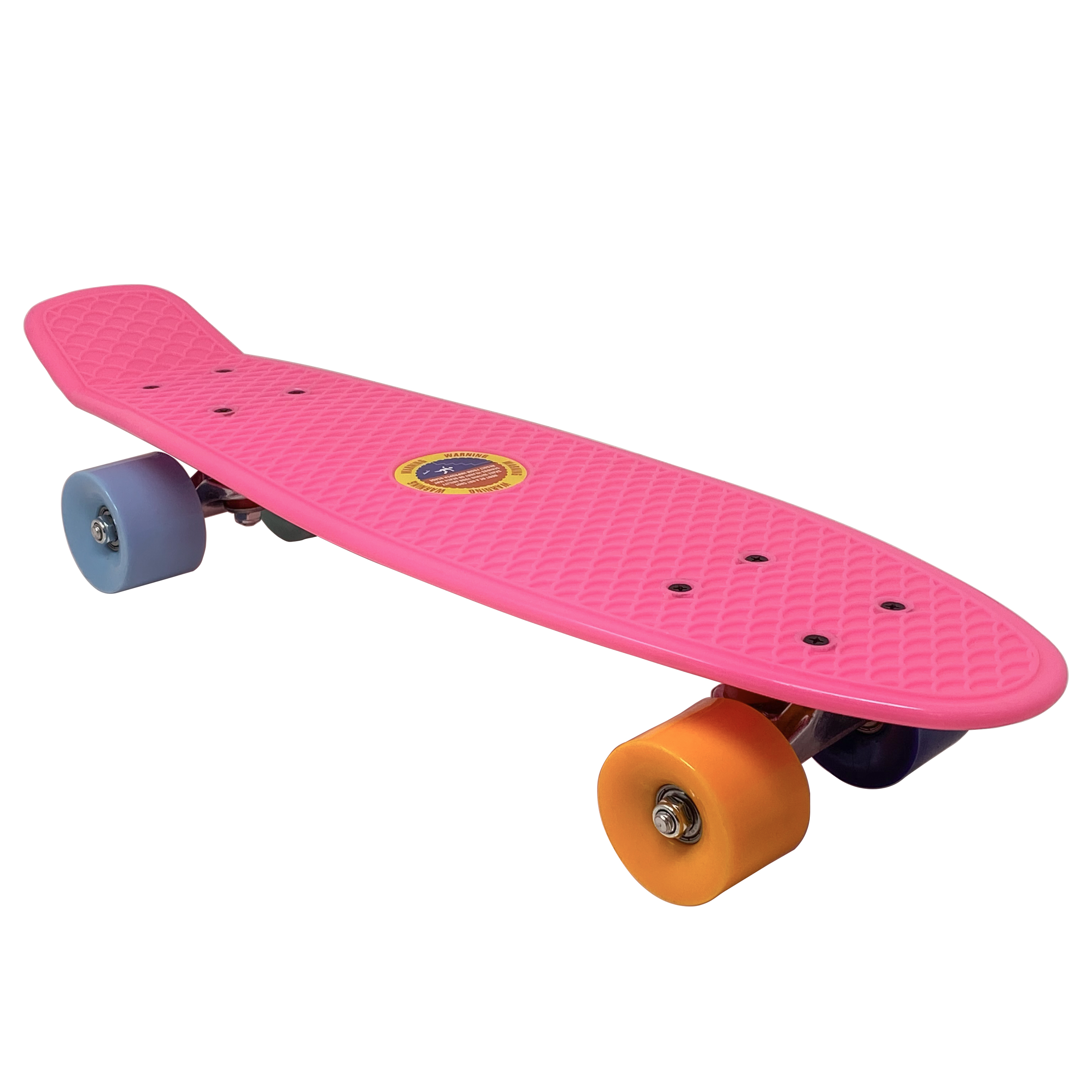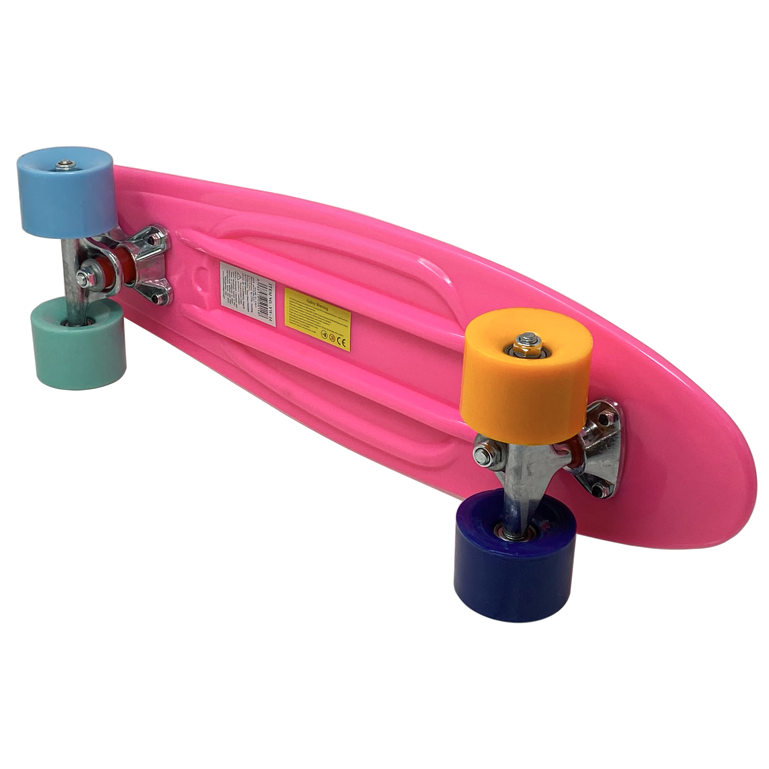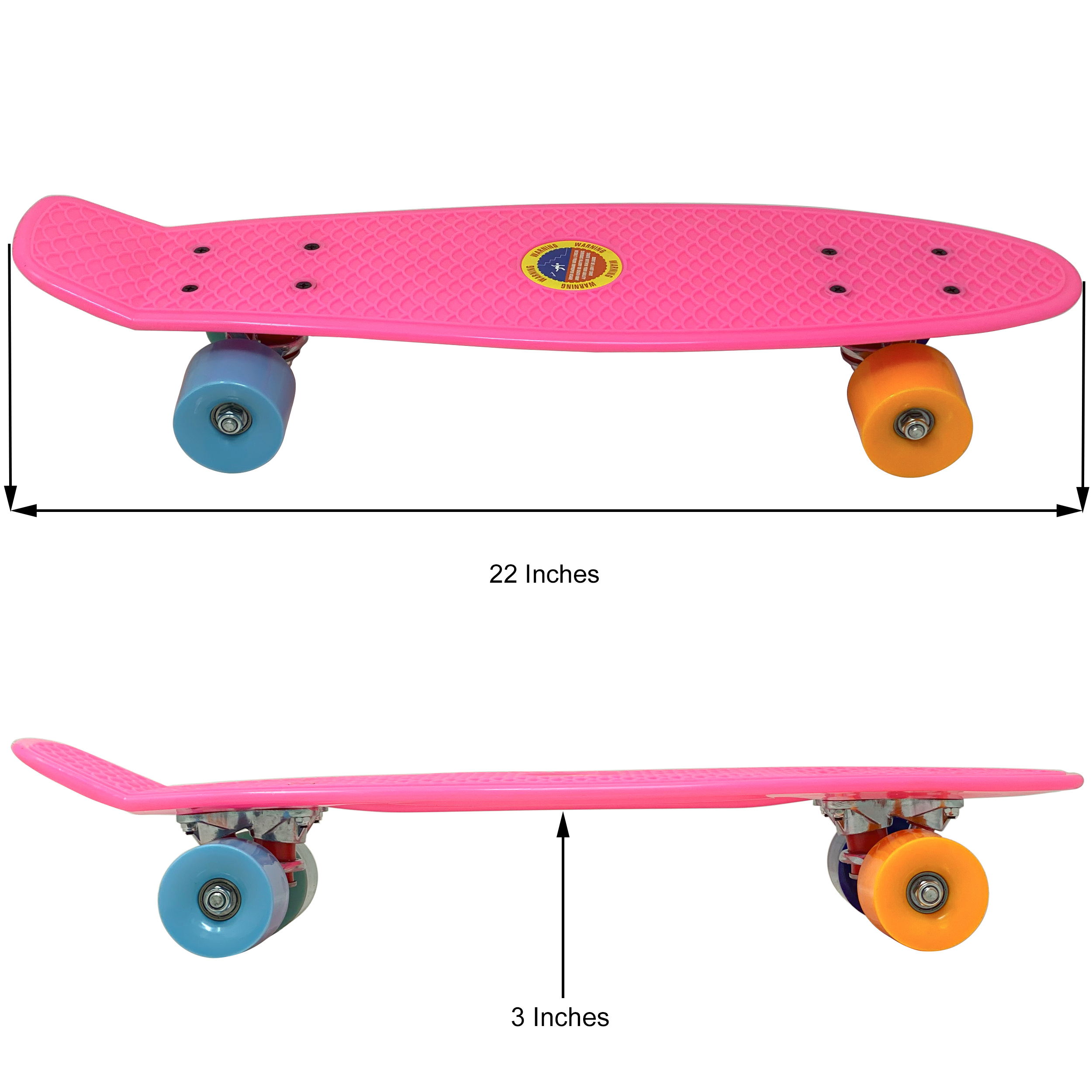 Retailery 22 Inch Skateboard With Colorful Wheels, Pink. This 22-Inch skateboard is a great starter board for kids, teens, and beginners. The board features anti-slip surface which allows for a stable grip when riding which is a plus for beginners. Can be used by teens and young adults to travel to and from skate parks, schools, university campus, and pretty much anywhere you can think of. Portable allows you to ride it and store it pretty much anywhere. It's made from ABS plastic which is durable and resistant. Its equipped with four coasters that are colorful which support your skateboarding on different street surfaces for a smooth ride as you glide! Measures: 22 inches long by 5.75 inches width by 3 inches high. Not Suitable for Children under 6 Years. PROPOSITION 65 WARNING: This product contains DEHP, a Phthalate chemical and other chemicals known to the State of California to cause cancer and/or birth Defects or other reproductive harm. For more information, go to: www.p65warnings.ca.gov/bpa.