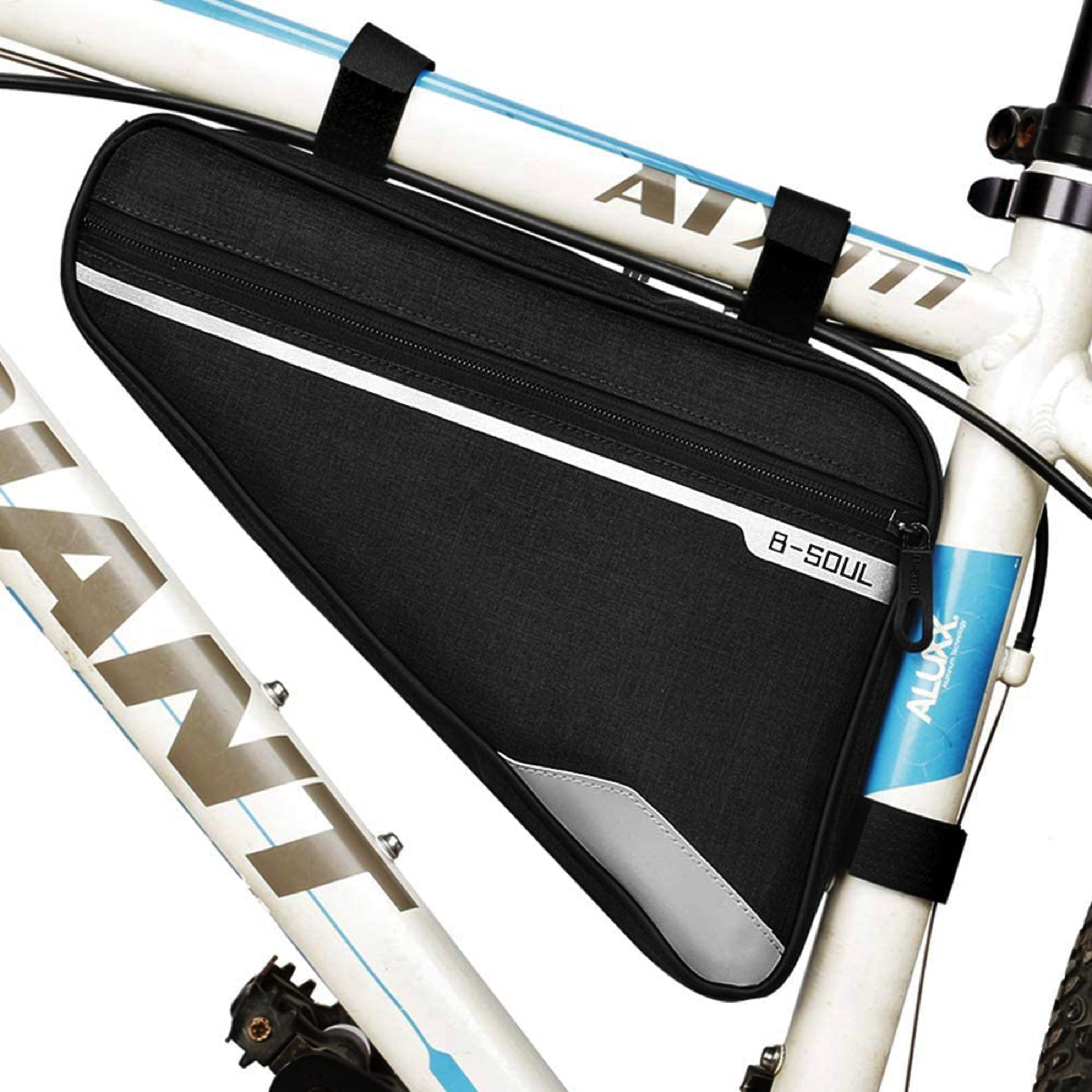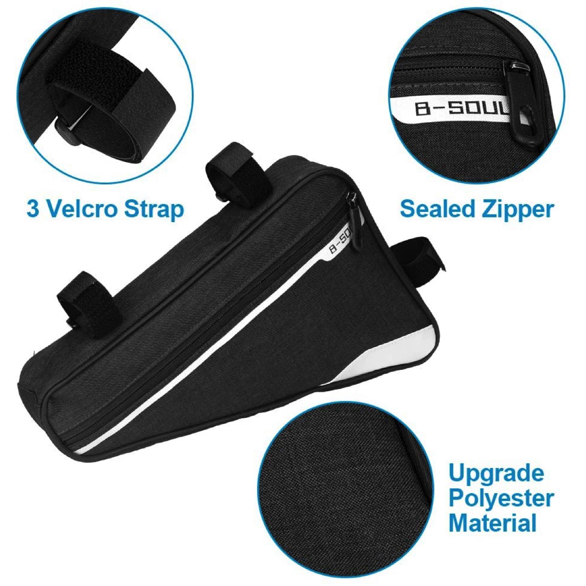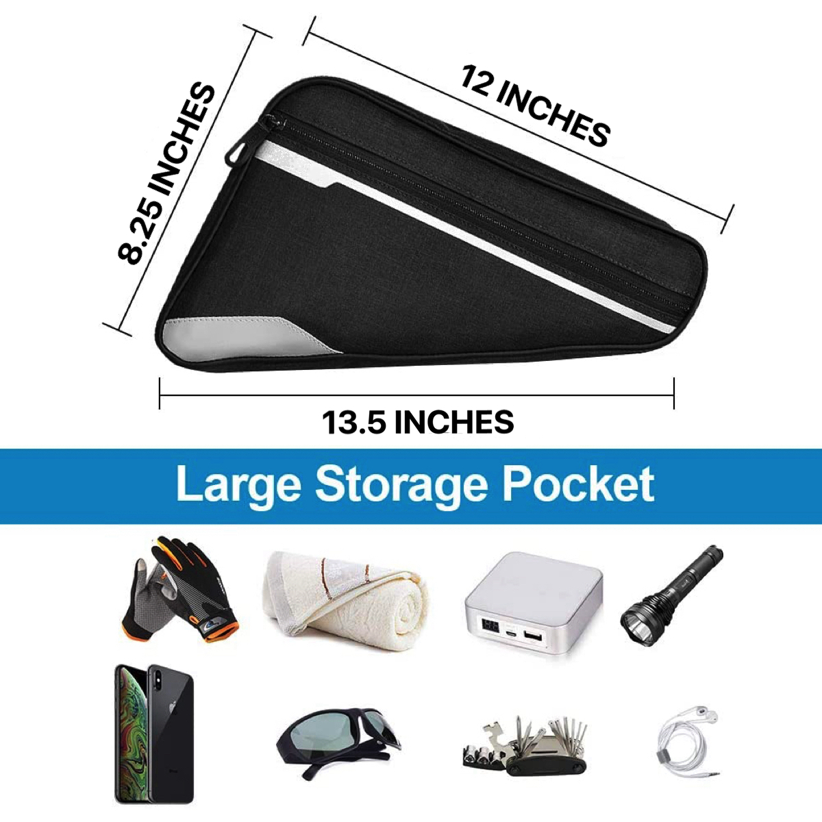 This is a water resistant triangle bicycle frame storage bag with a reflective side stripe for additional safety on night rides. With three adjustable velcro straps to provide stablity, you are ensured that your bag will stay in place. Large, durable zippers allow for ease of access and the triangle design fits most bike frames leaving enough space for your water bottle. The slim body design helps minimize wind resistance and prevents your legs from hitting the bag during rides. The weight of this frame bag is 4.4 oz which is ideal for long trips. This bicycle bag has a spacious storage pocket that is large enough to hold tools, a phone, keys and other necessities yet small enough to sit under the frame of your bike! An easy access mesh side pocket allows you to easily grab a snack while riding to help you keep moving without interruption.