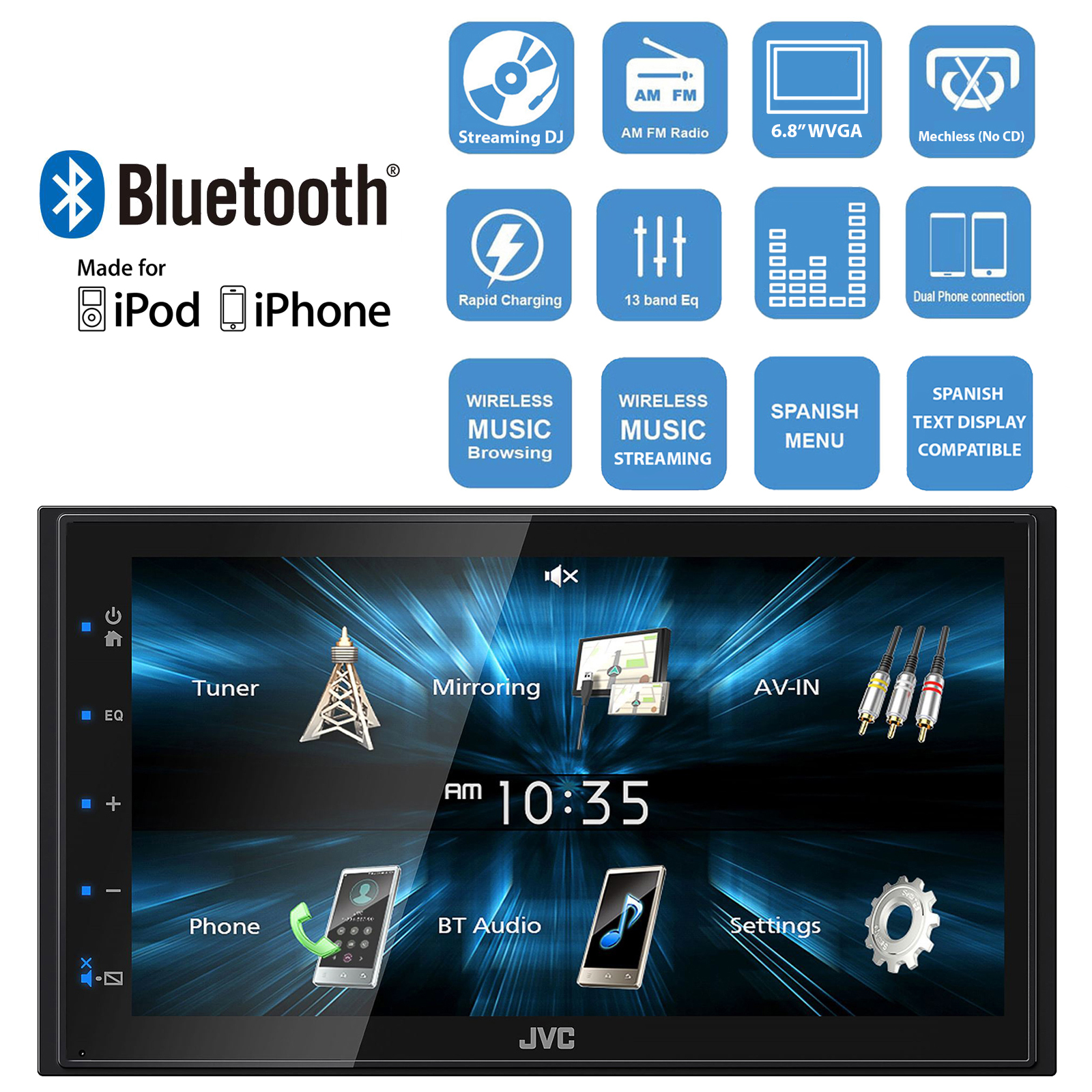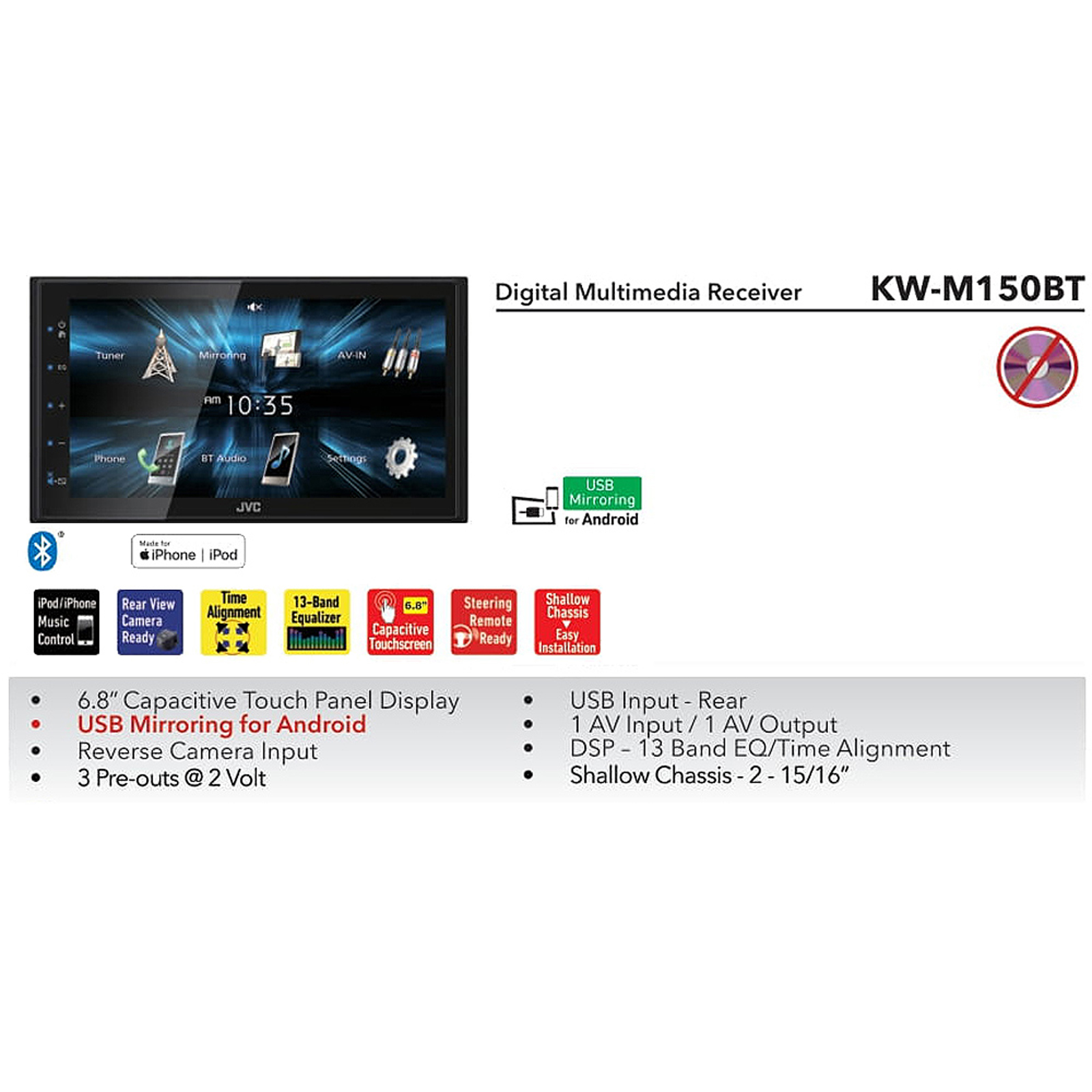 This JVC KW-M150BT digital media receiver features myriad media options and will boost your vehicle's entertainment system to the next level. This receiver comes packed with built-in Bluetooth capabilities, Android mirroring via USB, and a 13-band equalizer that will ensure you get the clarity and quality of audio your system deserves.
