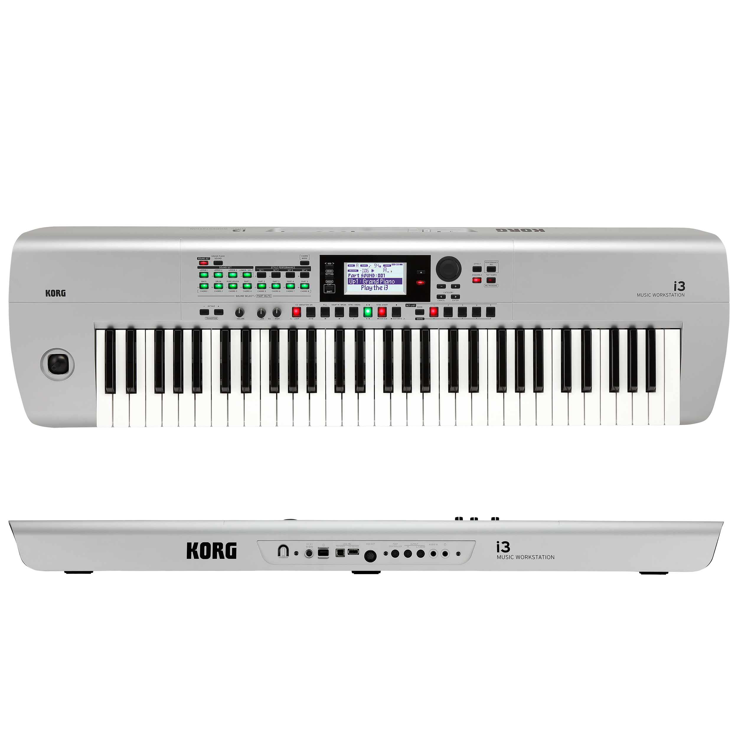 Inspiring, Intuitive, and Instant, With the i3 Music Workstation, your musical themes and phrases catch fire and quickly explode into complete ready-to-play productions. Grouping sounds, beats, and parts together by Sound Set and Style Performance Set streamlines the creative process, providing a shortcut to choosing the right sounds and pulling together the right beats and grooves. On-board effects and EQ tailor the sound for any performance. The sequencer records, saves, and plays both MIDI and audio files - you can even play along. Self-contained, simple to use, and fun to play, the i3 is the ideal synth for the budding composer, the energetic performer, or the inspired up-and-coming producer. Using battery power, the KORG i3 Music Workstation can run wherever you run; a convenient auto-power off function preserves battery life. The KORG i3 is a full-featured Workstation featuring 61 full-size, velocity-sensing keys. The keyboard response is adjustable using the three touch-curves; a fourth setting provides a fixed output level. OCTAVE buttons shift the pitch of the keyboard up or down by two octaves, in octave increments. The professional joystick allows real-time articulation of pitch bend, vibrato, and brilliance during performance; an additional two-band EQ (Low and High) provides a final adjustment to the overall tone. All front panel buttons and controls are conveniently grouped together by function, and the custom backlit LCD delivers valuable visual feedback regarding the instrument's current settings. A rotary data-wheel encoder can quickly edit the value of the onscreen parameters. The black-out finish, rubberized touch surface, and perforated end panels reflect the distinctive upscale design.