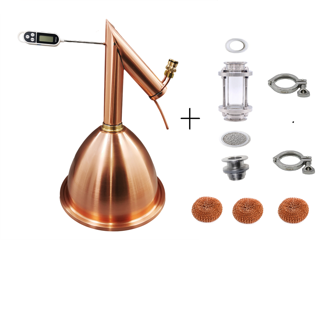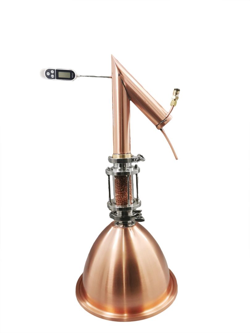 • This is upgrade Alembic dome and condensor kit with sight glass inserted between the dome and condenser. The sigh glass can be used as a Gin busket with a sieve between, or there's 3 x copper scrubber can be inserted into the sight glass to play as catylitic converter mesh. The extended height will also improve the separation of different chemicals to purify the spirits.