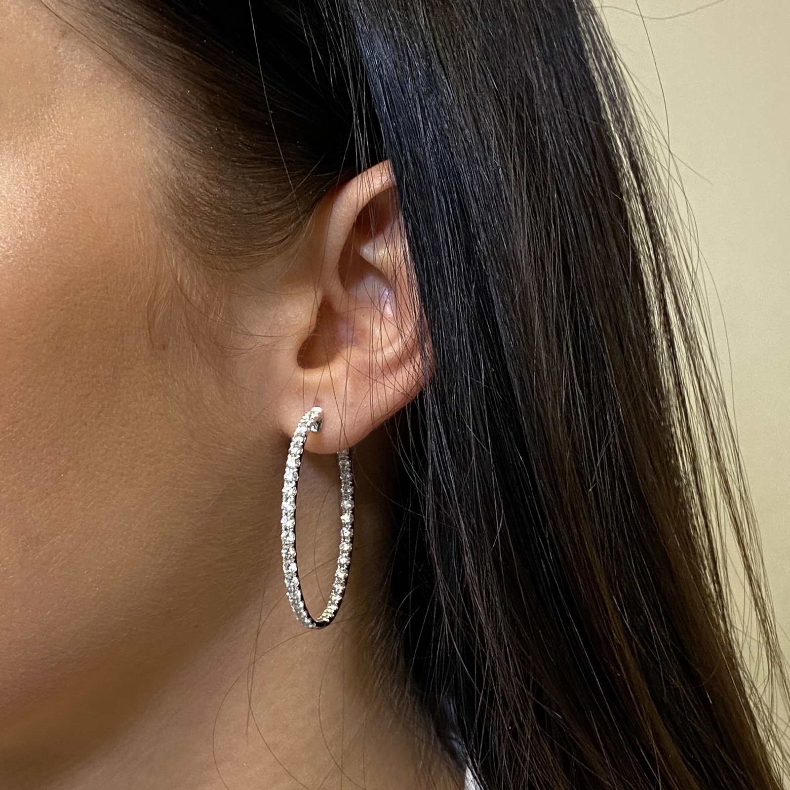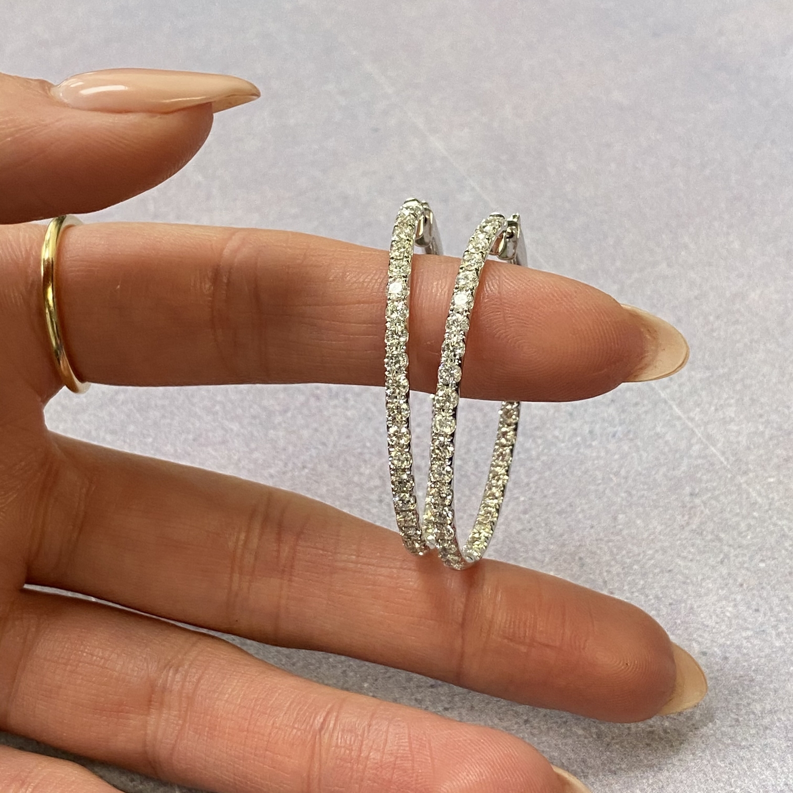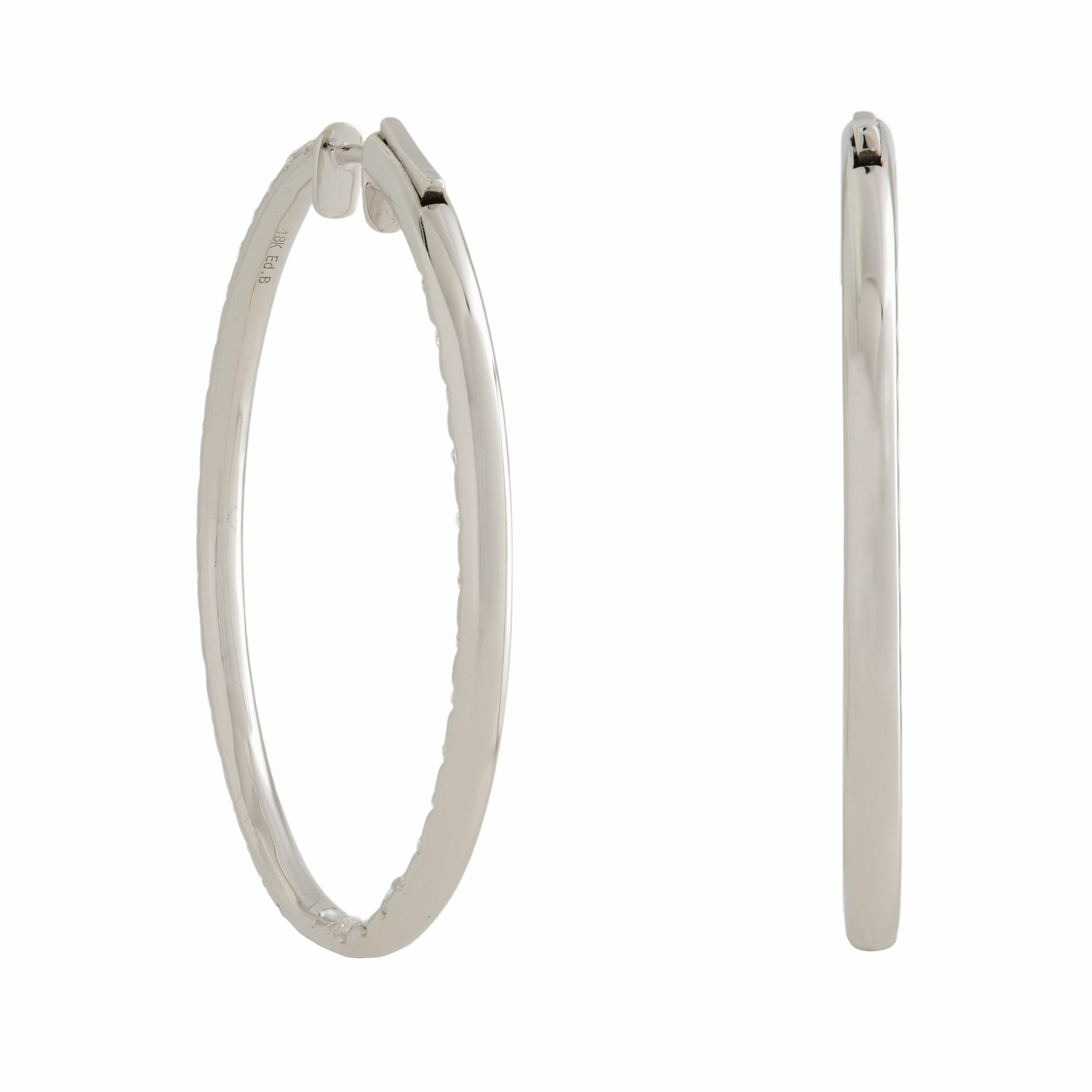 A very beautiful pair of Estate inside-out diamond small oval shape hoop earrings. Each earring is crafted in 18K white gold which are lined with sparkling round cut pave set diamonds. The stones line only half of the outer hoop and half of the inner hoop. Total carat weight: 3.30. Diamond color F-G and VS clarity. Length: 40mm, width: 33mm. Thickness: 2.40mm. Weight: 8.70 grams. Comes with a presentable gift box.