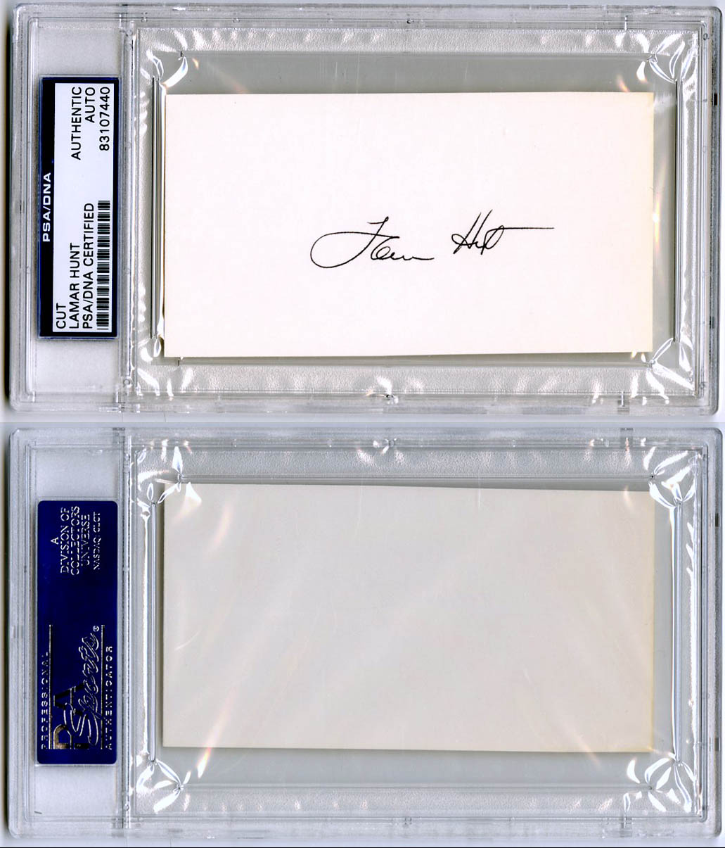 I have available this 3" x 5" index card that has been signed by Lamar Hunt. The signed index card has been encapsulated by PSA/DNA.