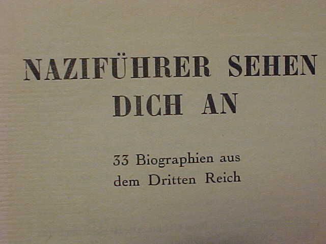 To my bidders: For years I have done business on eBay using the name: gpstorageco*. The items I will be selling from this point on are being sold from my estate and from the estates of friends and relatives.This Vintage Copy of "NAZIFUHRER SEHEN DICH AN 33 BIOGRAPHIEN AUS DEM DRITTEN REICH (NAZI LEADERS ARE WATCHING YOU)" belonged to a friend of mine who recently passed away. He had a great library of military & historical books he used for reference.