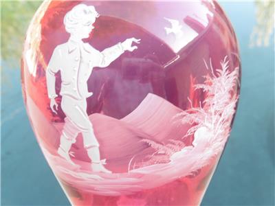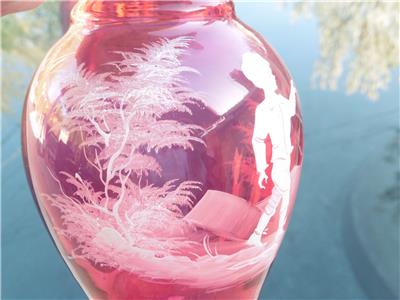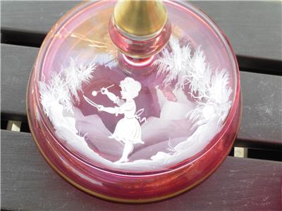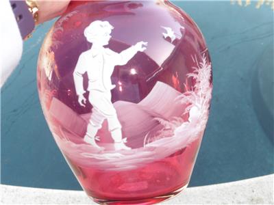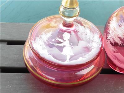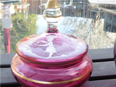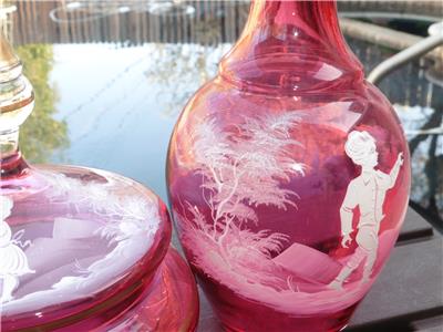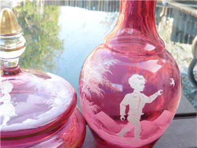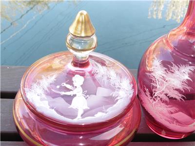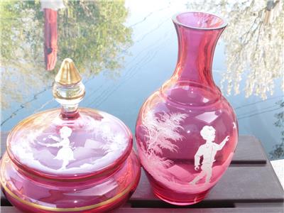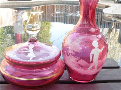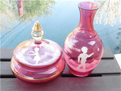 This is a very nice set of Bohemian Mary Gregory cranberry powder dish and bedside water pitcher/carafe. The water carafe is 8" high, 4" across, powder dish is 6.5" high, 6" across the widest point. Excellent condition, no chips, or damage on powder dish, tiny nick on rim of water pitcher/carafe.