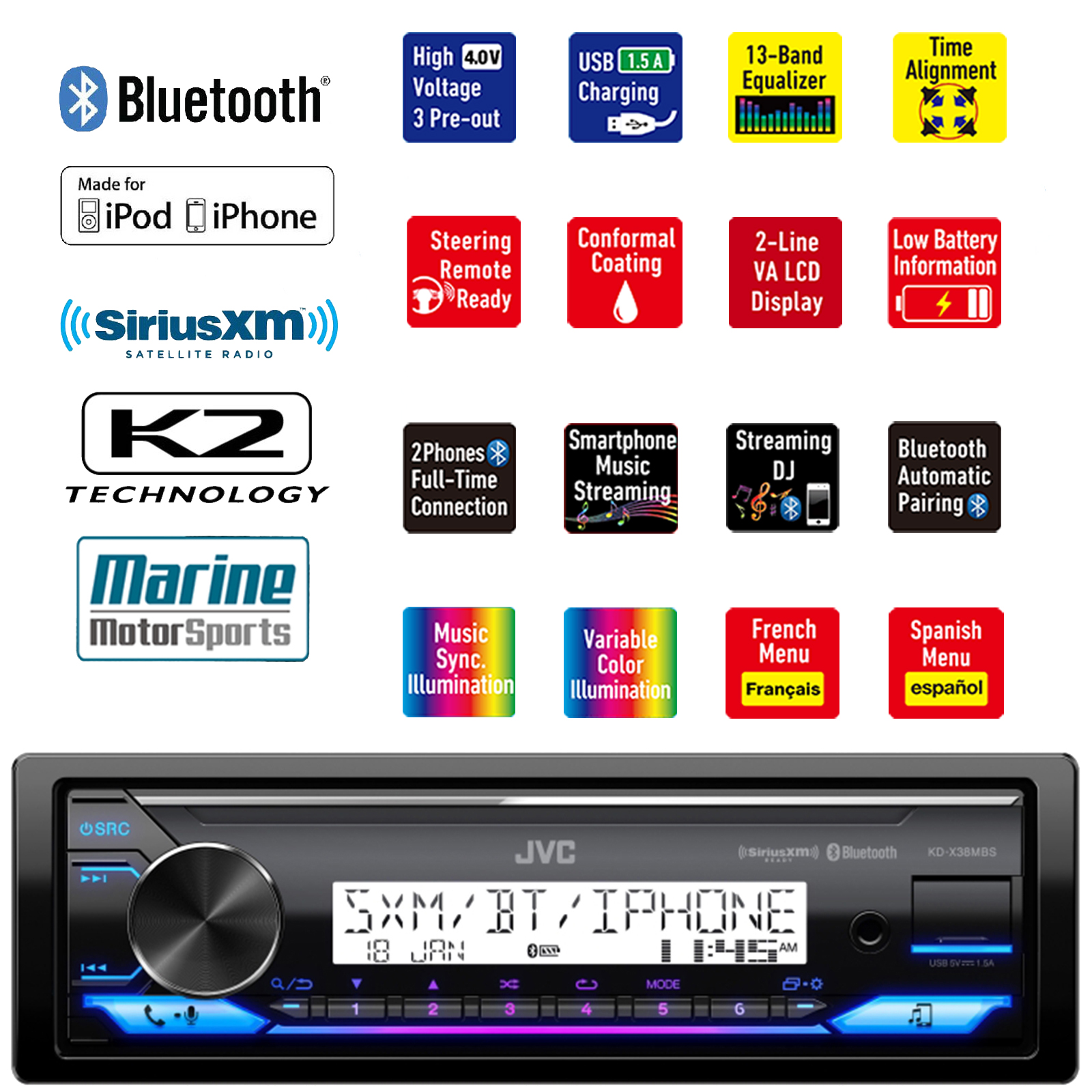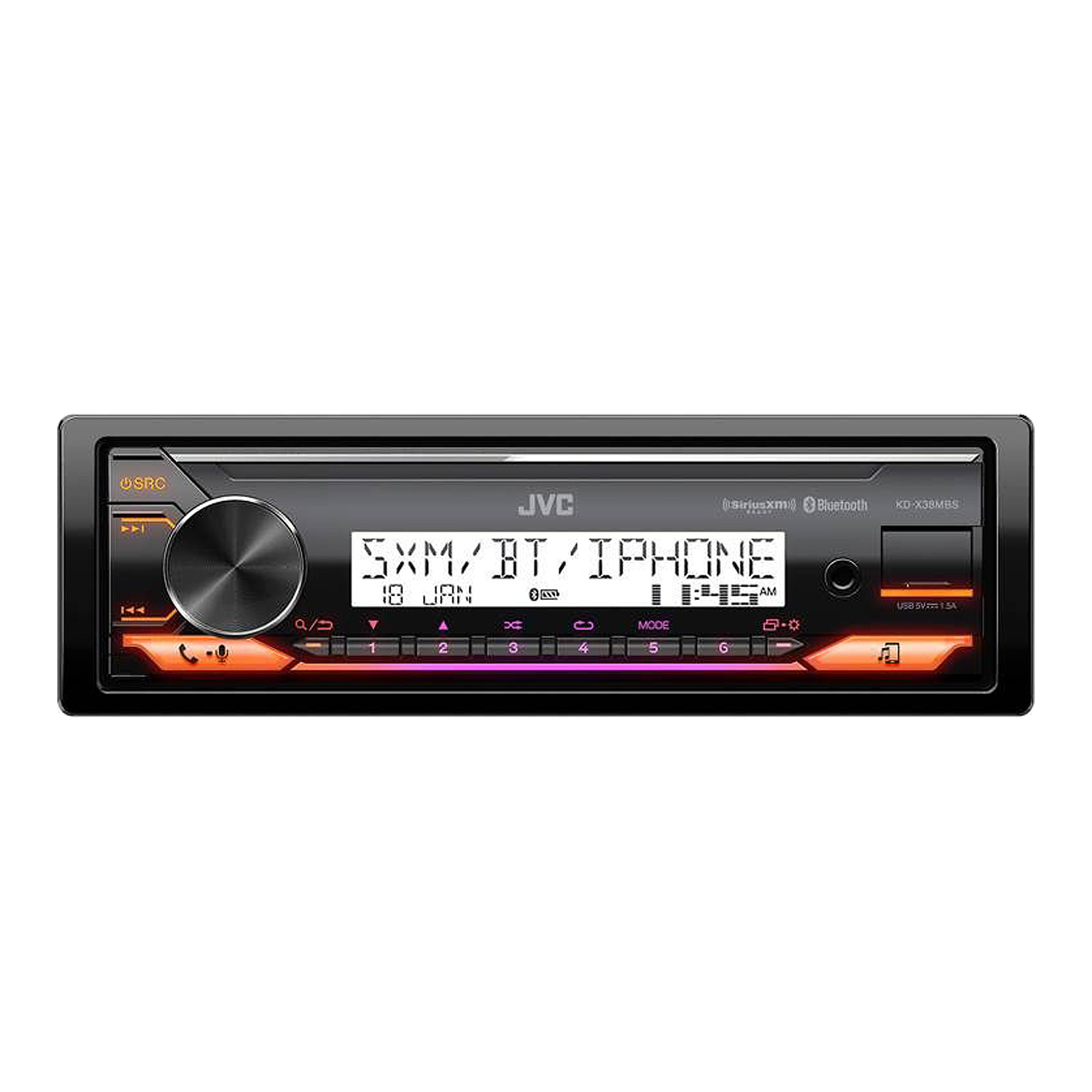 JVC KD-X38MBS marine digital media receiver is outdoor-ready, thanks to a conformal-coated circuit board that resists moisture damage. It's white-background display cuts through glare and makes this receiver ideal for out door and open-top vehicles. Also features built-in Bluetooth, an option for satellite radio, and plenty of connections for your digital devices, you'll have lots of music options on the road, trail, or water.