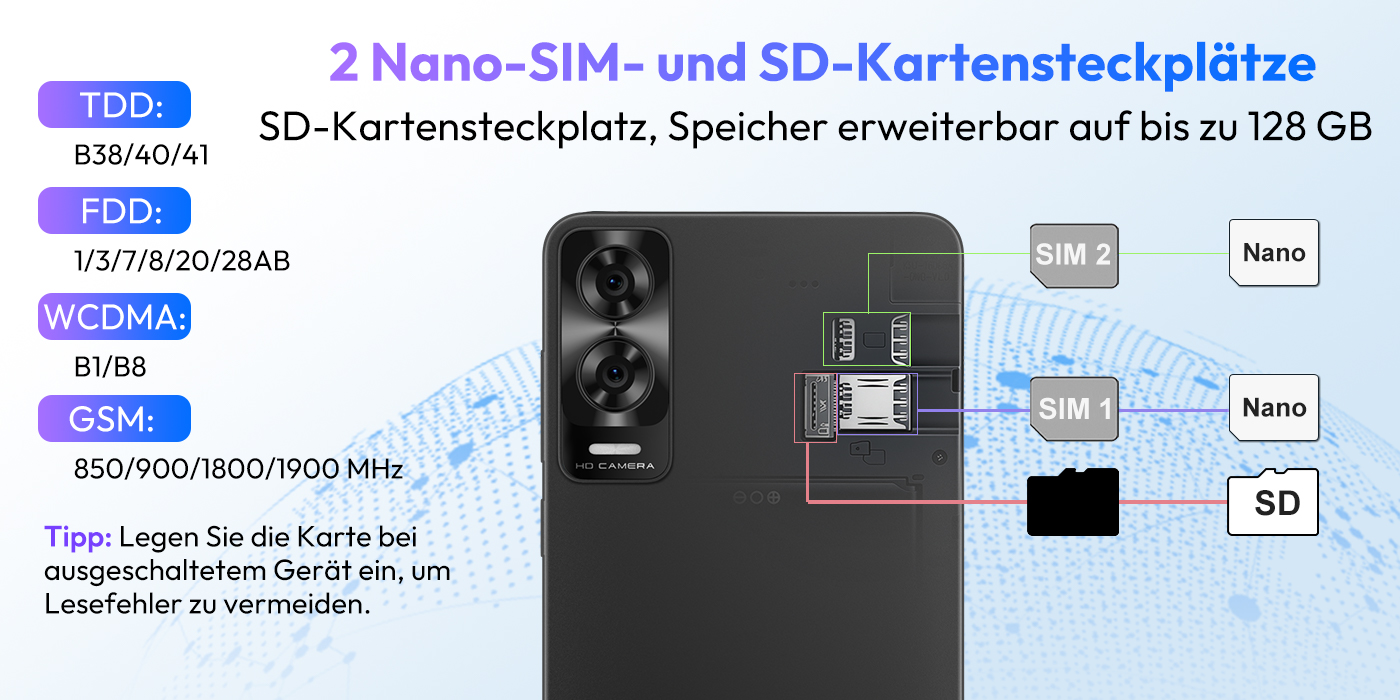 Frage: Ist es ein 4G-Telefon? Welche SIM-Kartengröße wird benötigt? Antwort: JA. Es ist ein 2+1-Kartensteckplatz-Design. SIM2 ist für Micro, SIM1 ist für Nano , die andere ist TF-Karte (bis zu 1 TB Erweiterung, nicht enthalten). |