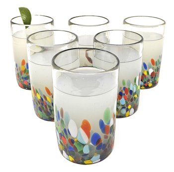This traditional set of 6 hand blown drinking glasses with a confetti carmen design is perfect for your next fiesta! Use them to serve water, juice, soda or alcohol. The set adds a great sense of elegance to the dining room that will be enjoyed by everyone. Each blown glass may vary slightly in size and show tiny bubbles within the glass that develop from the blowing process. Lead-free, made from sustainable recycled glass. Hand-washing recommended, but dishwasher safe on the top rack. Exceptional artisan quality, thick and sturdy glass. Proudly hand made in Mexico.