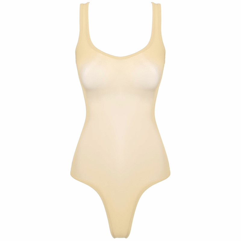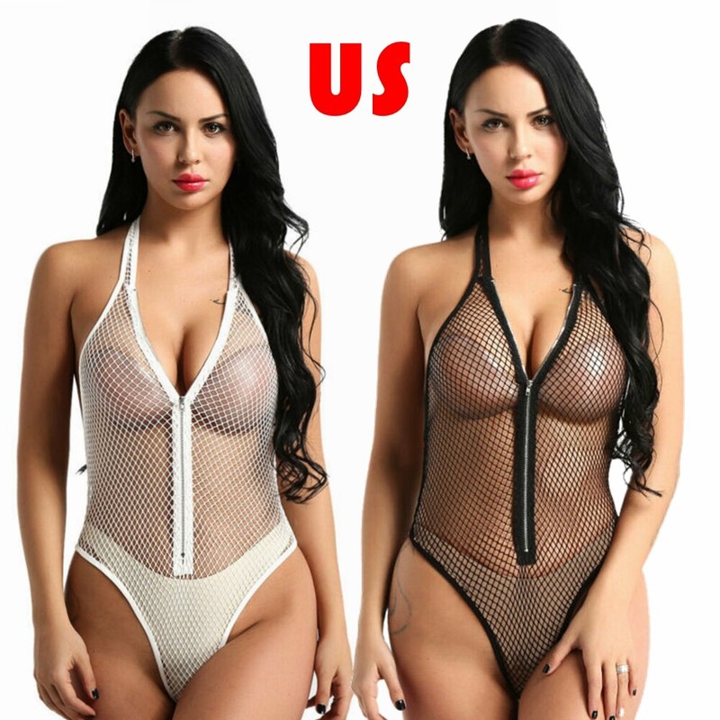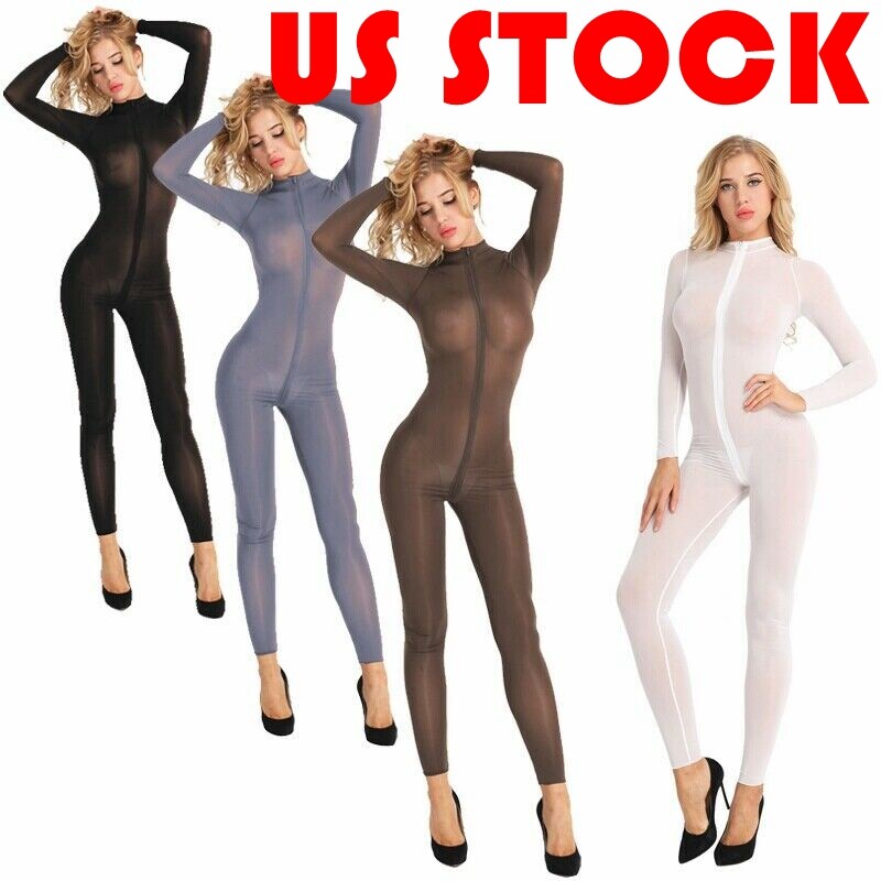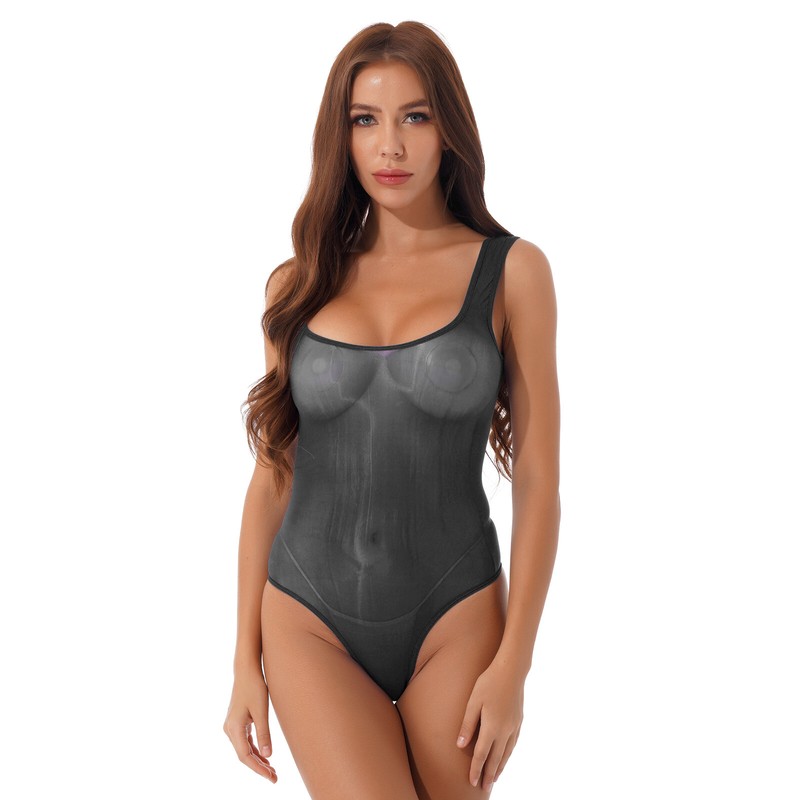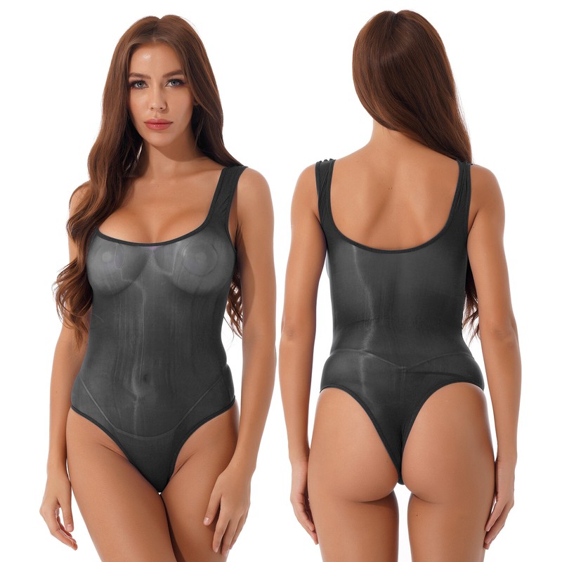 Women Glossy Scoop Neck Sleeveless Bodysuit Underwear See-through Leotard.