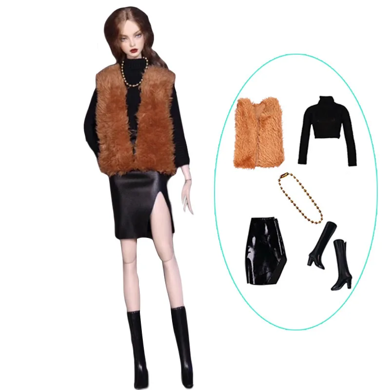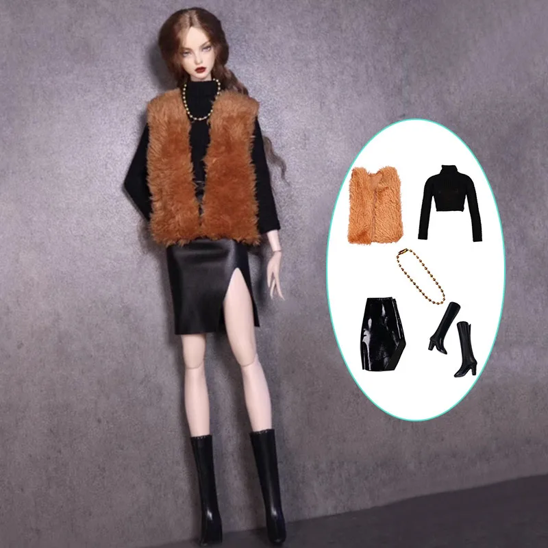 Fur Fashion Outfits For Barbie Doll Clothes Set Black Sweater Vest Coat Leather Skirt Necklace Shoes 1:6 Dolls Accessories