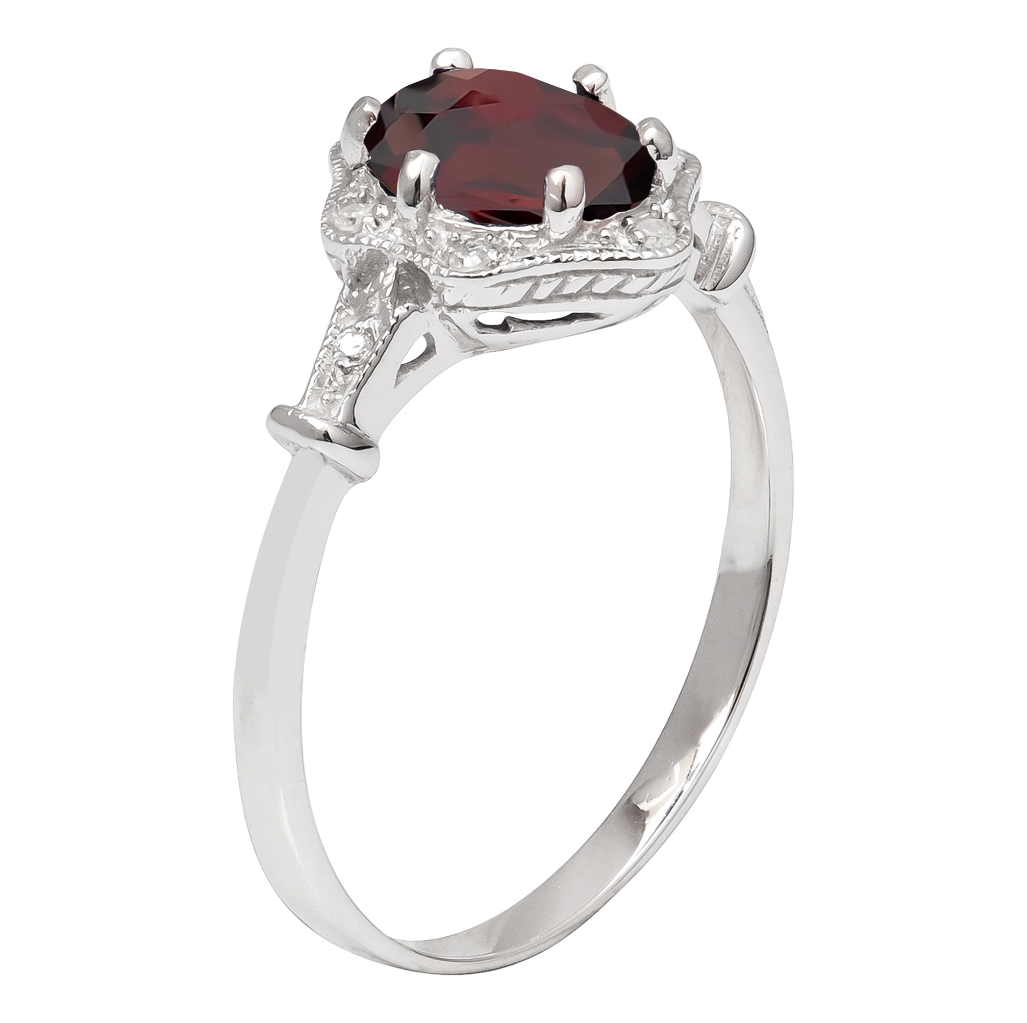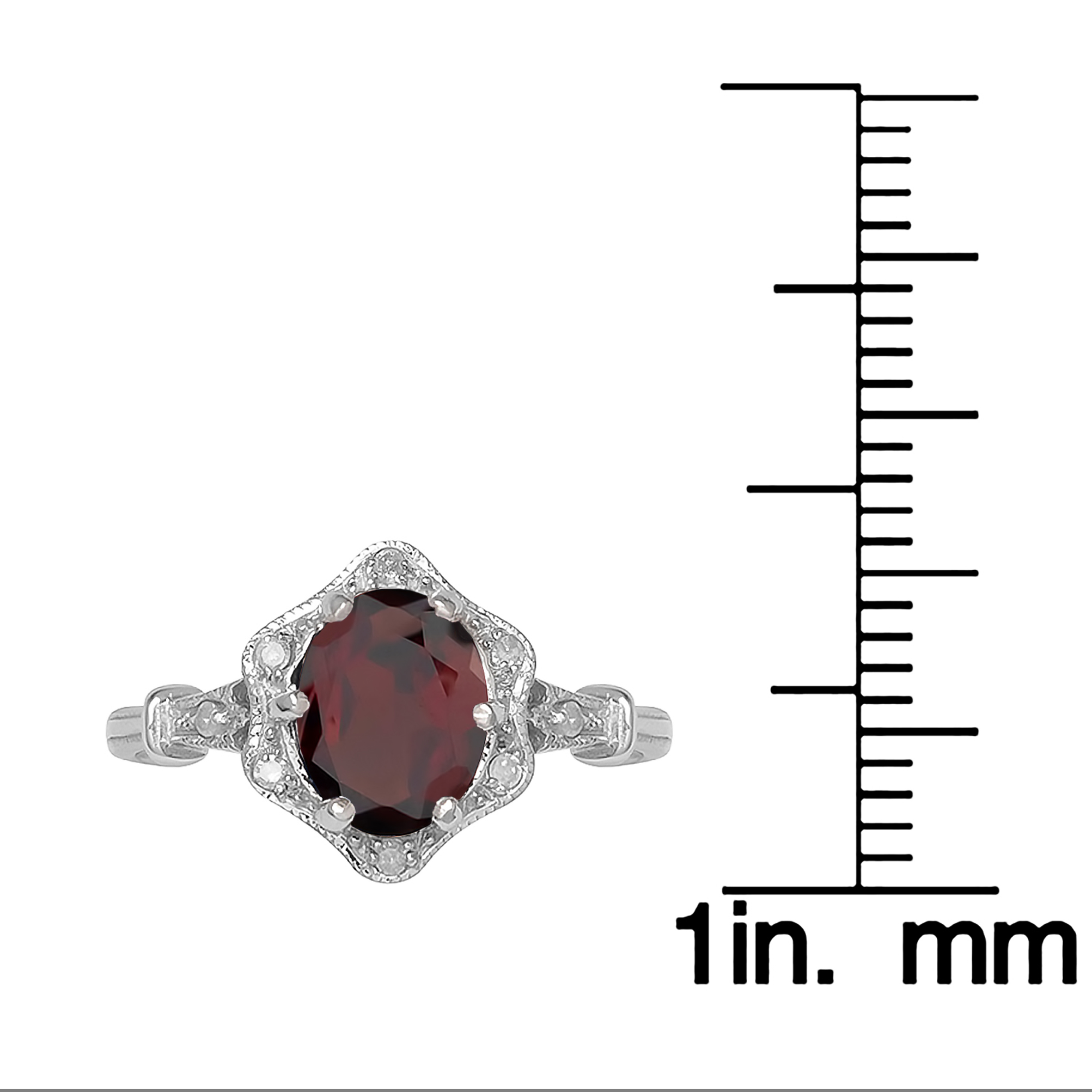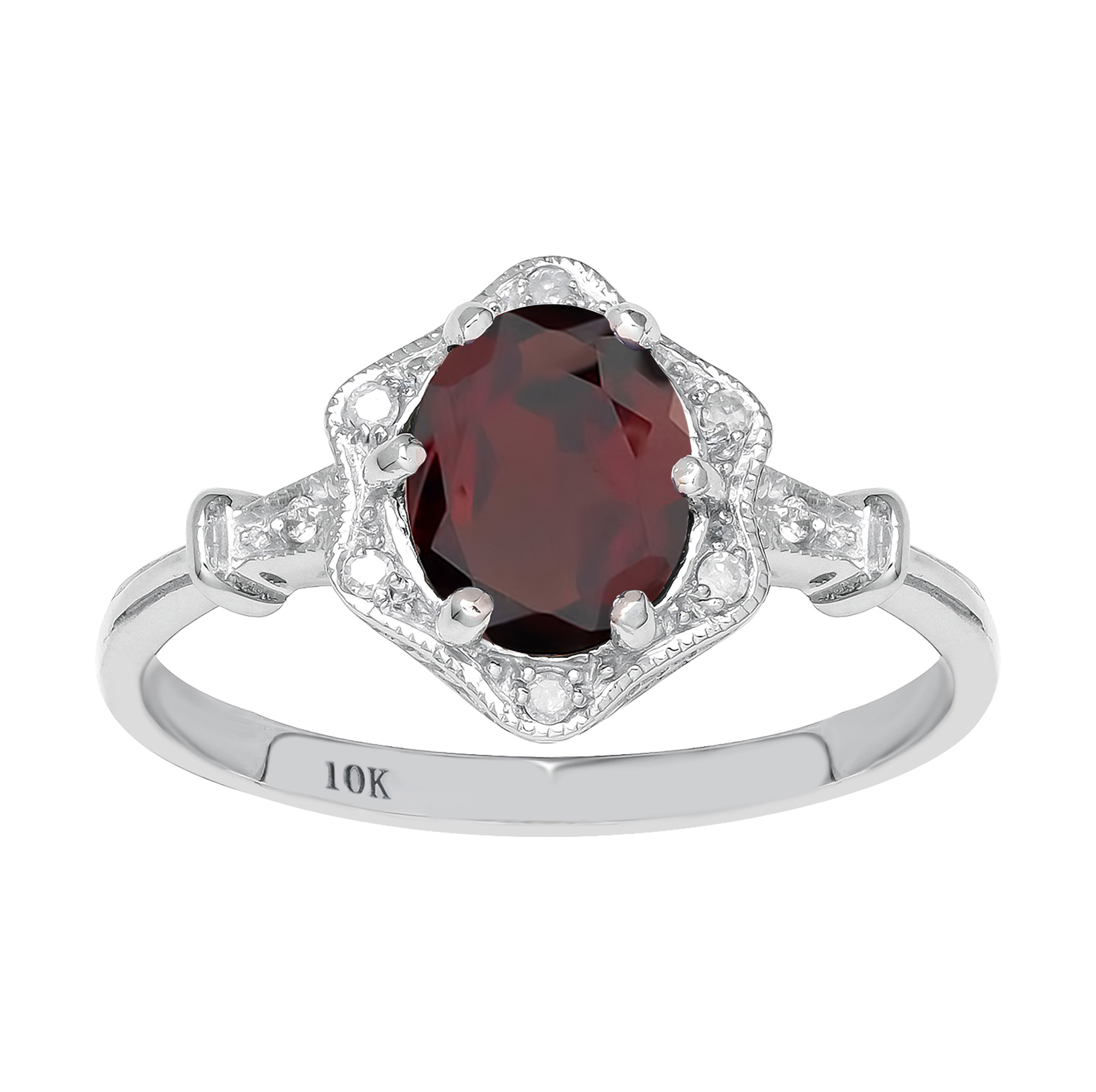 Enhance any wardrobe with this beautiful Garnet and diamond ring. This vintage inspired design showcases a genuine natural 8x6 mm oval Garnet and a curved halo of brilliant white diamonds. Crafted of 10k white gold, this piece is a wonderful addition to your jewelry collection. This item is shipped with a free elegant ring box.