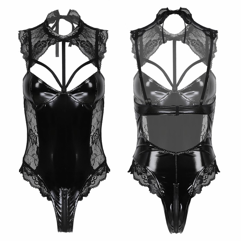 Women ladies one-piece patent leather leotard bodysuit, wet look appearance.