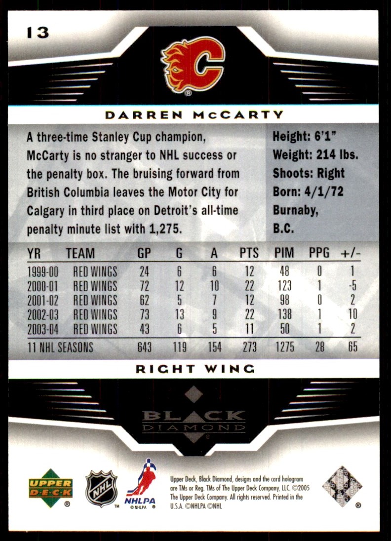 | Description: | Darren McCarty | | Category: | Hockey | | Year: | 2005 | | Product: | Upper Deck Black Diamond | | Team: | Calgary Flames | | Card Number: | 13 | | Dimensions: | 3½" x 2½" |