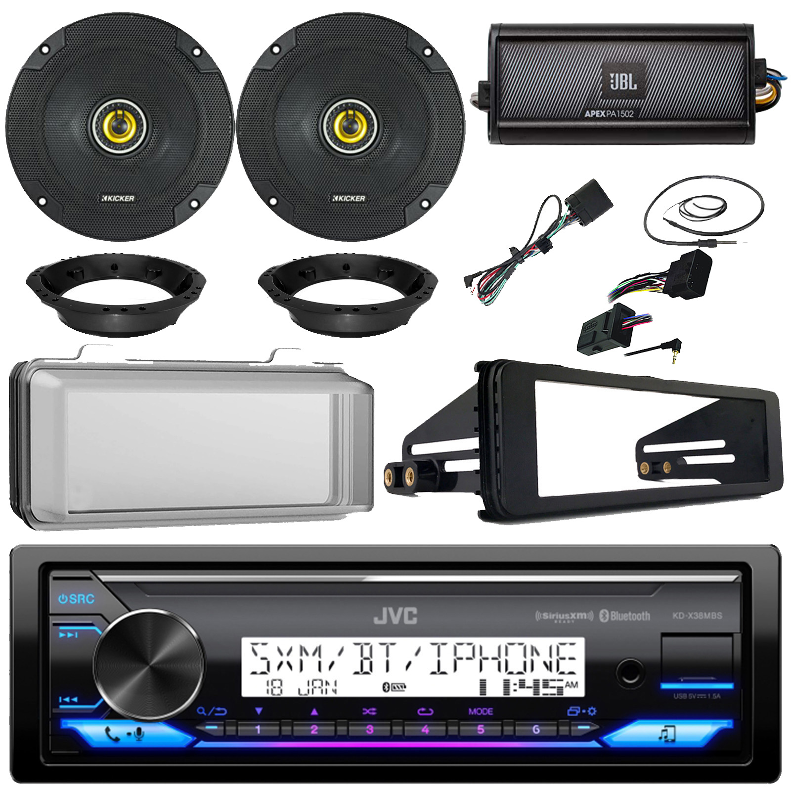PACKAGE BUNDLE INCLUDES: JVC KD-X38MBS Single-DIN Marine Bluetooth MotorSports USB/AUX LED Illumination AM/FM Radio SiriusXM Ready Stereo Receiver, Single-DIN Stereo Install Kit & Radio Cover, 2x Kicker CSC65 CS Series 6.5" 300W Max Power 4 Ohm 2-Way Coaxial Speakers, Mounting Ring Adapter for 6.5" to 6.75" Speakers, JBL Apex Series PA1502 2-Channel 750W Max Power Class D Amplifier, Handlebar Control Interface, 22" Radio Antenna