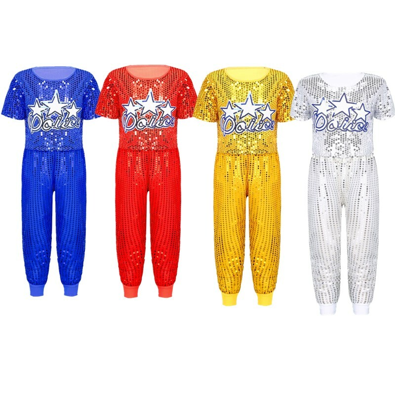 Matching with elastic waistband shorts, sparkling sequins decorated outfit, perfect for dance wear.