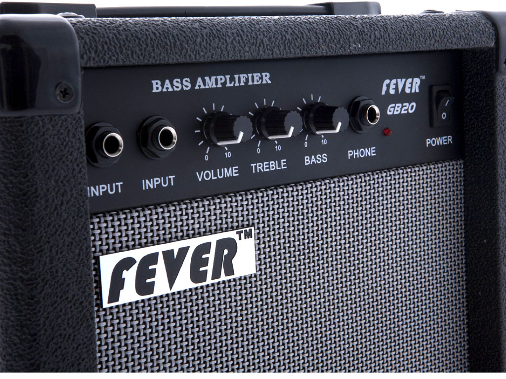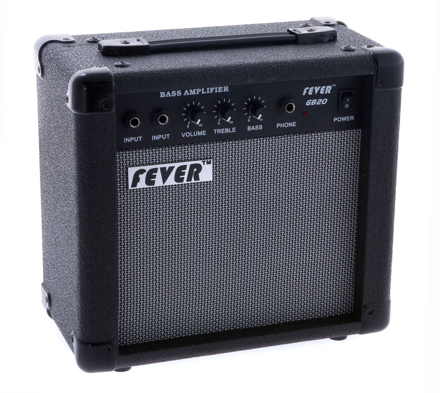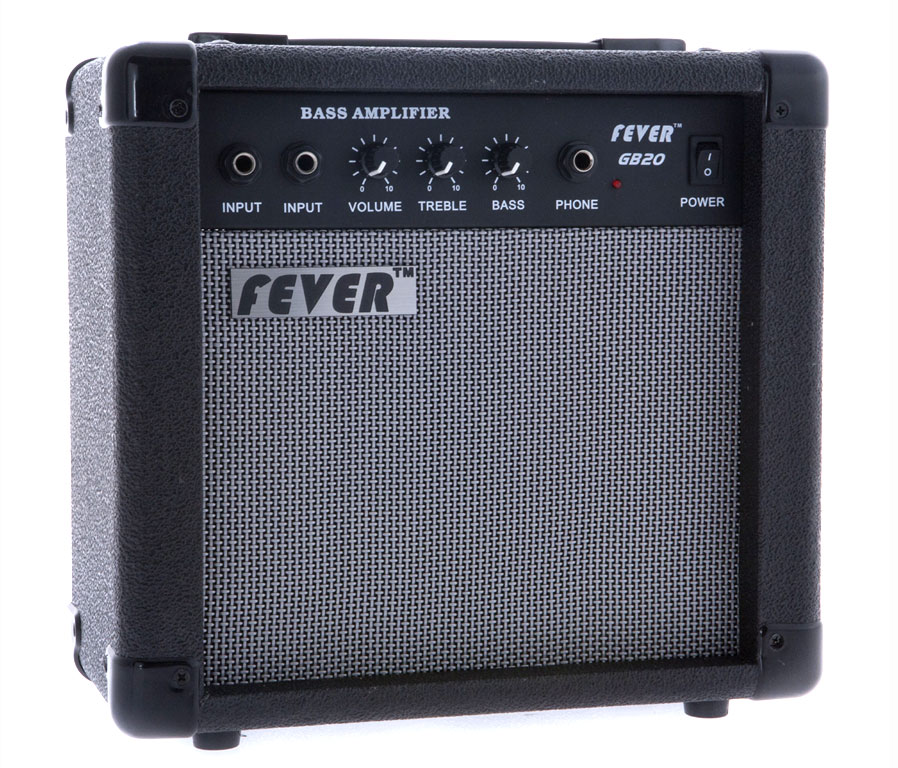 Fever 20 Watts Bass Amplifier practice amp loaded with features. Features include two 1/4" input Volume Treble and Bass Controls 1/4" jacks for headphones output power cable included.