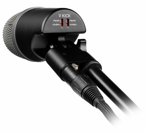 The V KICK is one of the most compact and versatile drum microphones in its class, intended for use with kick (bass) drums and other sources such as miking bass guitar speaker cabinets, floor toms or other large drums where low-frequency energy is of the utmost importance. Its integrated swivel joint allows for any required mic placement, and its specialized capsule provides a sound character tailored specifically for kick drums, which can be further shaped with the use of two switches on the rear side of the microphone. From warm and classic to modern and aggressive, the V KICK gives you any kick drum sound you need. The V KICK’s extremely low profile allows for effortless placement outside or inside a kick drum, with a wide range of swivel for easy positioning. And with the stand mount and the XLR connector mounted side-by-side in parallel on the underside of the mic, your mic cables stay flush with the mic stand—no cable clutter, completely minimal footprint, and easy to place anywhere.