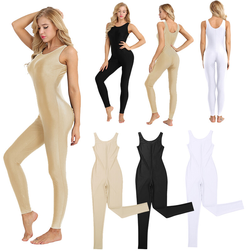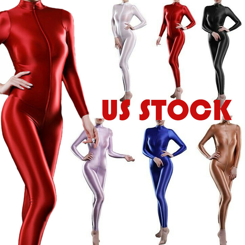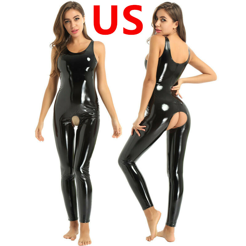 Women’s one-piece wetlook bodysuit leotard, zipper crotch design.
