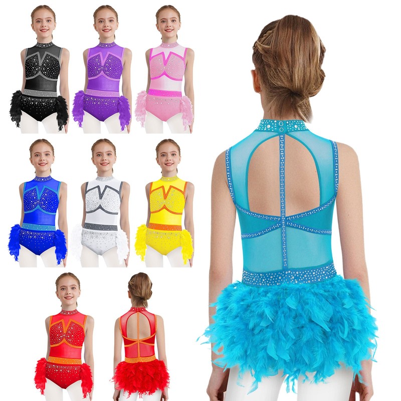 Back waist is adorned with tiered mesh ruffles and feathers. Full lining for comfy wearing. Beautiful dancewear for your girl.