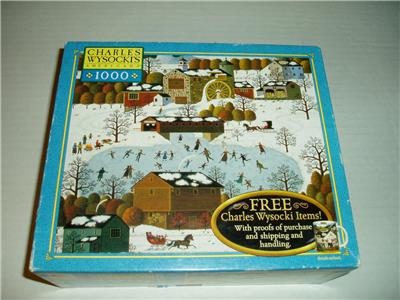 You Are Bidding on a Used 1000 piece Hasbro Puzzle dated 2004 with artwork by Charles Wysocki.Puzzle will measure 22 9/32 x 25 9/32 inches when complete.Pieces are small and not meant for small children. Box and Pieces are in good used condition.I have not assembled the puzzle and I can not guarantee that it is complete but puzzle was counted and has 1008 pieces.Puzzle is sold as is.