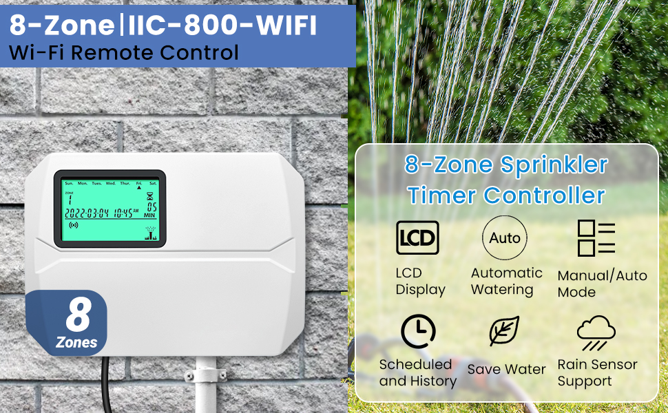 This smart sprinkler controller has been developed to control up to eight zones of water individually or at the same time. It also supports automatic watering mode and manual watering to allow different water needs for each zone.