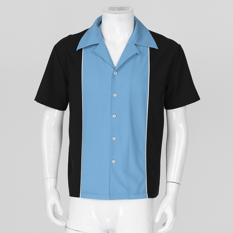 Mens Short Sleeve Button Bowling Shirt Color Block Turn-down Collar Tops with Pocket.